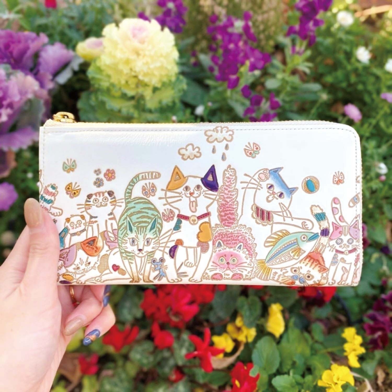 個性的なネコたちがいっぱい描かれた長財布。大きく開いてお札もカードも一目瞭然です。