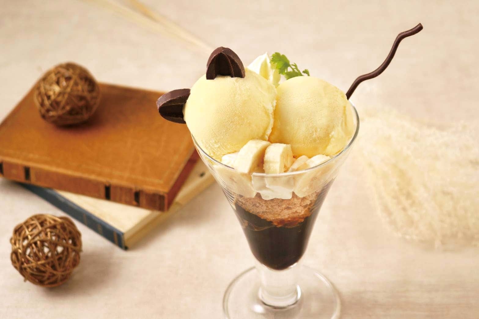 ほろ苦コーヒーゼリーにサクサクのフレーク、ホイップクリーム、バナナを詰め込んだパフェの上に、バニラアイスの白猫ちゃんをのせました。猫の日フェア限定の甘くて可愛いパフェです。
