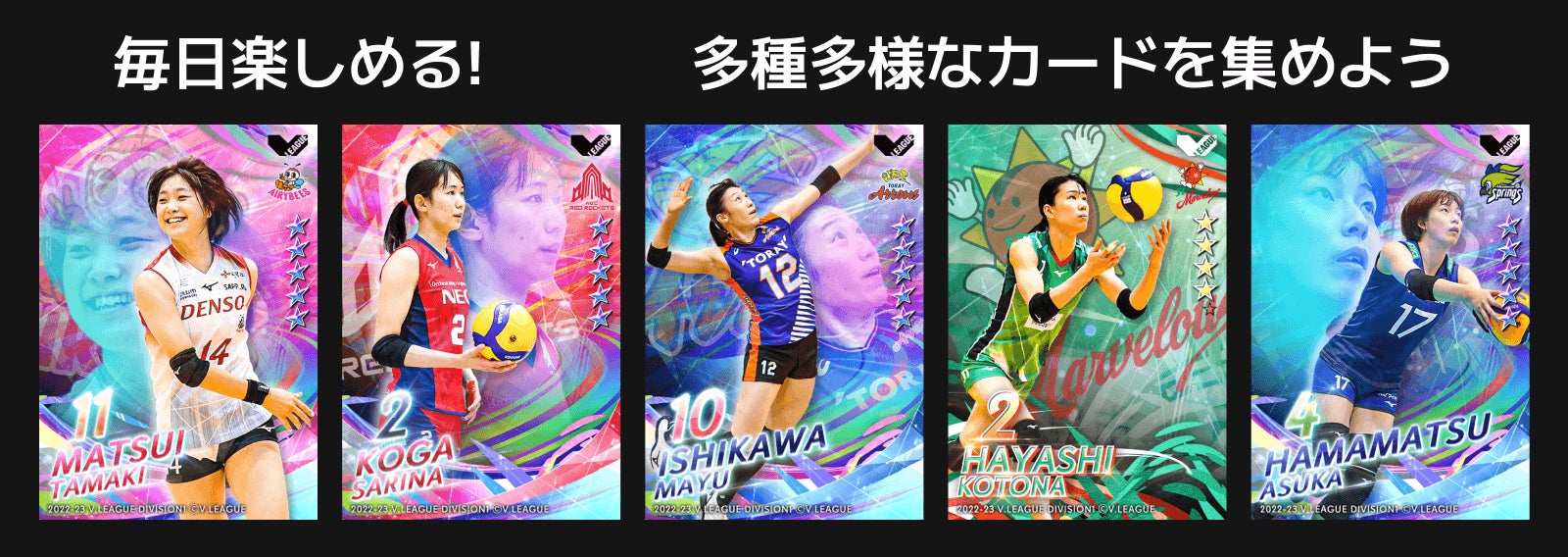 Vリーグでの白熱した試合の様子を、各選手ごとのデジタルカードとしてお届けいたします。レア度に応じて趣向を凝らしたデザインで制作された選手カードを収集しながら、数々のミッションをクリアし、ファン同士でランキングを競い合う、バレーボールファンが毎日楽しめるサービスを提供いたします。Vリーグでのプレーシーンを中心に、選手のオフショット企画等、様々な素材を使った幅広いデジタルカード展開を予定しております。