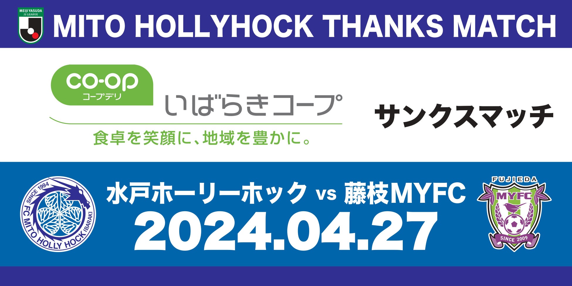 4月27日(土)に開催するホームゲーム、2024明治安田J2リーグ第12節 水戸ホーリーホック vs. 藤枝MYFCをいばらきコープ生活協同組合にご支援いただき『いばらきコープサンクスマッチ』として開催いたします。
