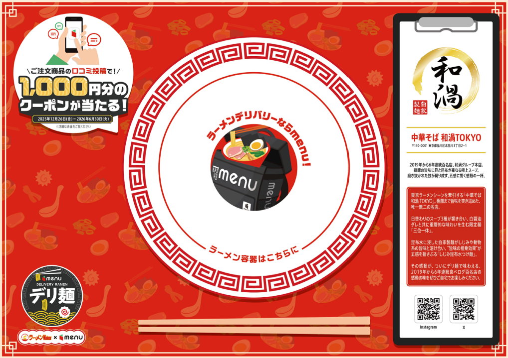 menu株式会社(本社:東京都新宿区、代表取締役:信田篤男)が運営するデリバリーアプリ「menu」は、デリバリーラーメン(デリ麺)を日常に根付かせることを目指す「デリ麺プロジェクト」に参加するラーメン店を対象に、商品注文後に口コミを投稿した方の中から、毎月各店舗5名様に1,000円分のクーポンが当たるキャンペーンを、2025年12月26日(金)から2026年6月30日(火)まで実施します。