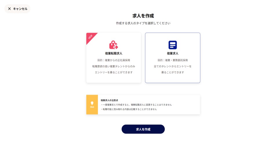 2. ログイン後、求人作成のページへ移動し、複業求人を作成するボタンをクリックします。複業転職求人を作成する際は利用できませんのでご注意ください。