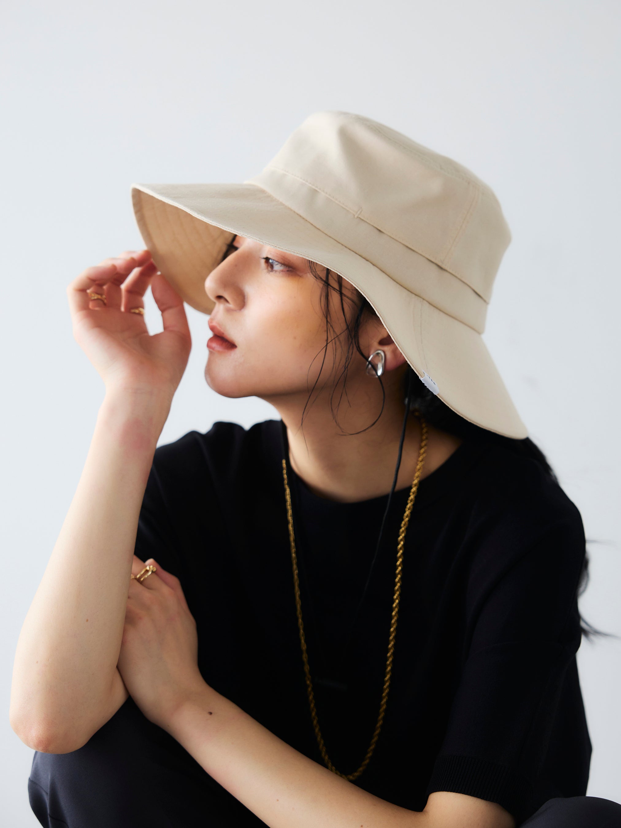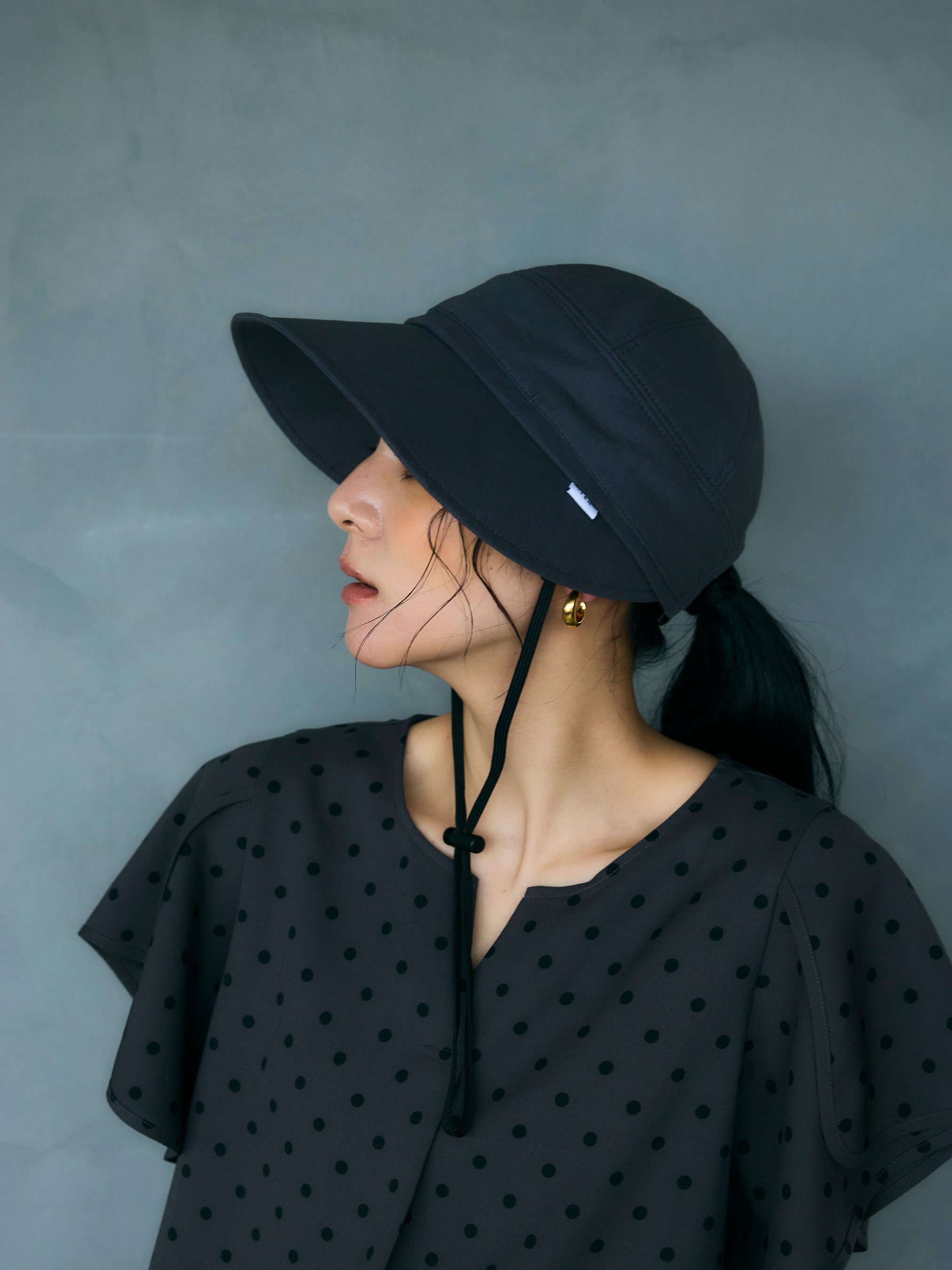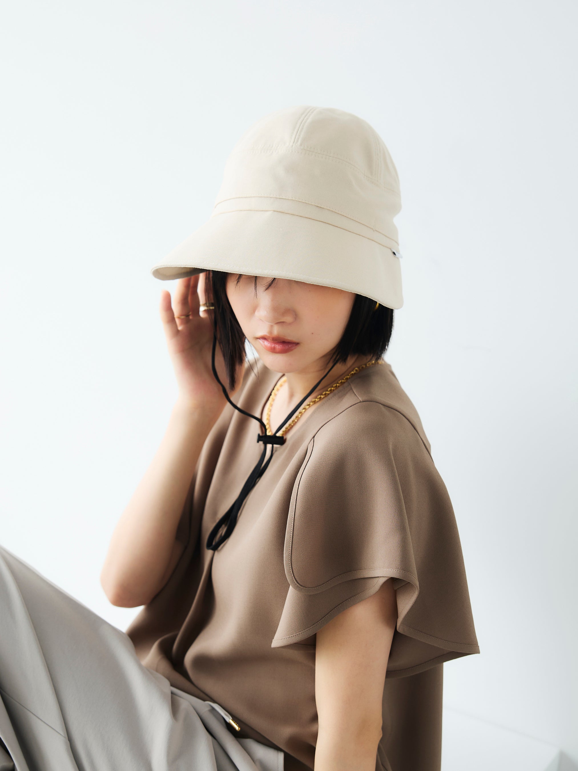 深めのシルエットで小顔効果も実現。アクティブなシーンに欠かせないコード紐をあしらいながらも、全体のシェイプを上品に仕上げることで、アウトドアからタウンユースまでシームレスに活躍するアイテムです。