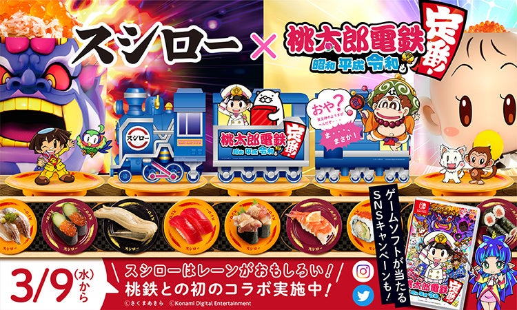 <3月9日(水)より全国のスシローにて期間限定で開催>食べて投稿すると桃鉄ソフトが抽選で当たる!SNSキャンペーンも実施!