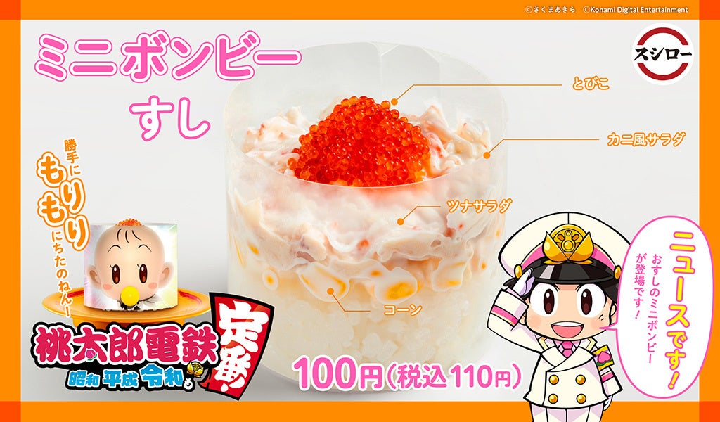 今回、コラボする「桃鉄」はプレーヤーが鉄道会社の社長になり全国の物件を手に入れながら、総資産日本一を目指す大人気ゲームです。老若男女に愛される「桃鉄」の中でも、人気キャラクターである「ミニボンビー」と最凶キャラクターである「キングボンビー」が、なんとおすしになってスシローのレーンに登場します。可愛さ満点の「ミニボンビー」と、迫力満点の「キングボンビー」のおすしは、レーンに列車が流れた後に続いて登場します。さらに、店内ではゲーム内で聞こえるあの音楽が流れ、列車で旅するゲームの世界観を店舗全体でお楽しみいただくことができます。この商品はスシローでも人気の、盛りに盛った“てんこ盛り”のうまさを味わえるコラボ商品です。「ミニボンビーすし」は、100円(税込110円)ですが「かってにもりもりにちたのねん!」という「ミニボンビー」の可愛らしいおせっかいをテーマに、スシローこだわりのコーンに、ツナサラダやカニ風サラダと人気のサラダネタをトッピングしました。スシローでもお子様に人気のネタを100円(税込110円)でこんなに盛った1皿をぜひご賞味ください。対して、「キングボンビーすし」は最凶といわれるキャラクターを再現すべく、迫力満点、贅沢ネタをこれでもかと盛り、「どうやって食べたらいいかわからない」と食べ方に迷うようなおすしに仕上げました。まぐろにサーモン、ほたてにいくら等、贅沢に盛られたネタをぜひご賞味ください。