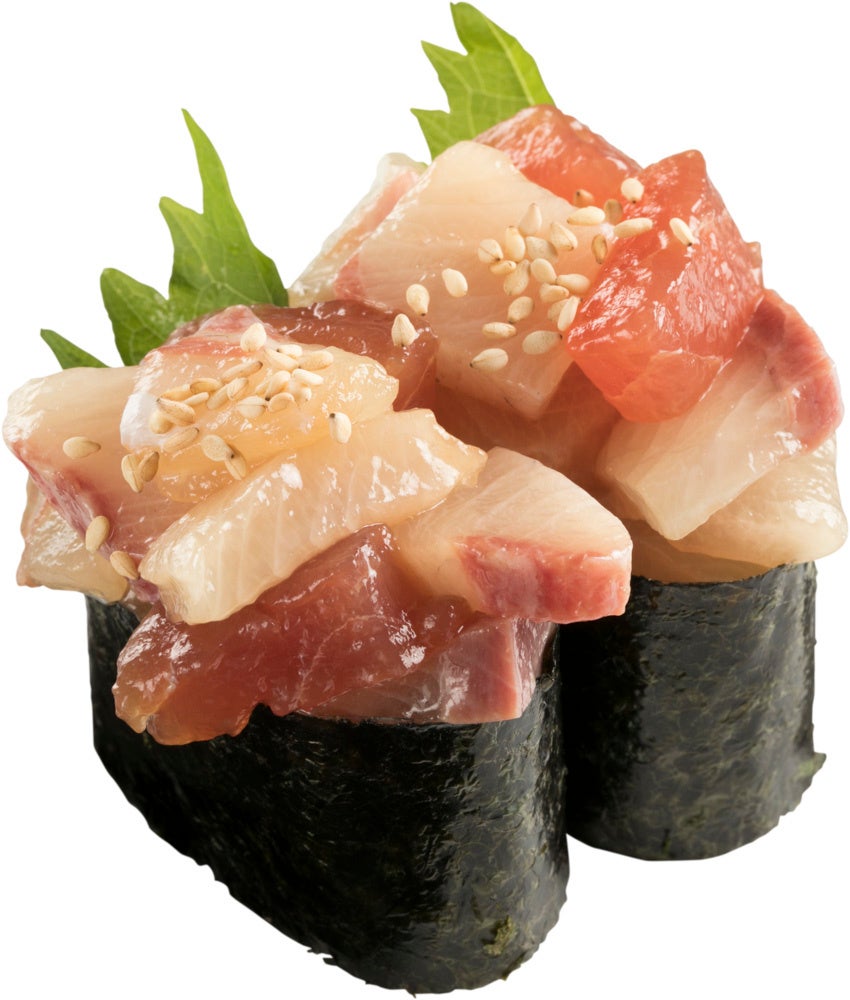 メニュー表に記載がなく、レーンにしか流れていないまぼろしのおすし「まぼろしの倍盛り海鮮漬け」。サイズが小さくおすしにできない希少部位を店内で漬けて軍艦にしたもの。てんこ盛りに盛られたこのおすしは、見たら手に取るべき1皿です。