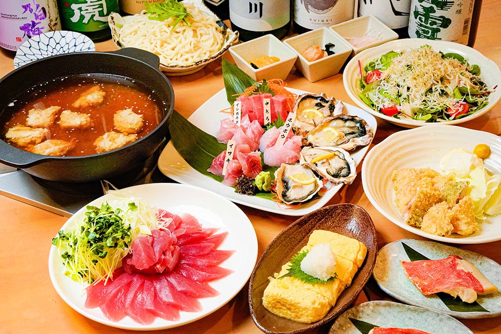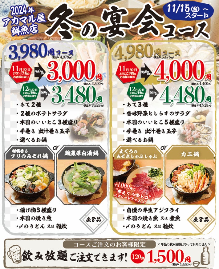 飲食事業と水産事業の両軸経営により水産の 6 次産業化に取り組む株式会社 SANKO MARKETING FOODS(以下 「当社」)が運営する『アカマル屋鮮魚店』大山店、府中店、溝の口店、武蔵新城店では、2024年11月15日より、旬の魚介をさまざまな料理でご堪能いただける冬の宴会コース2種の提供を開始いたします。