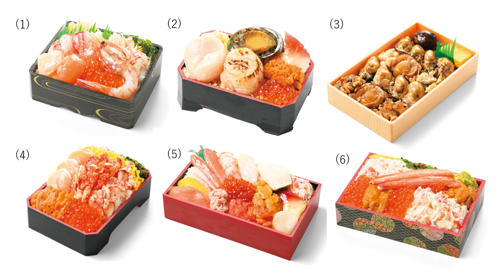 ウニ、殻付きアワビに北海道産のホタテ、ホタテ炙り、イクラ、ホッキ貝の6種が一度に楽しめる、見た目のインパクトも抜群な弁当。