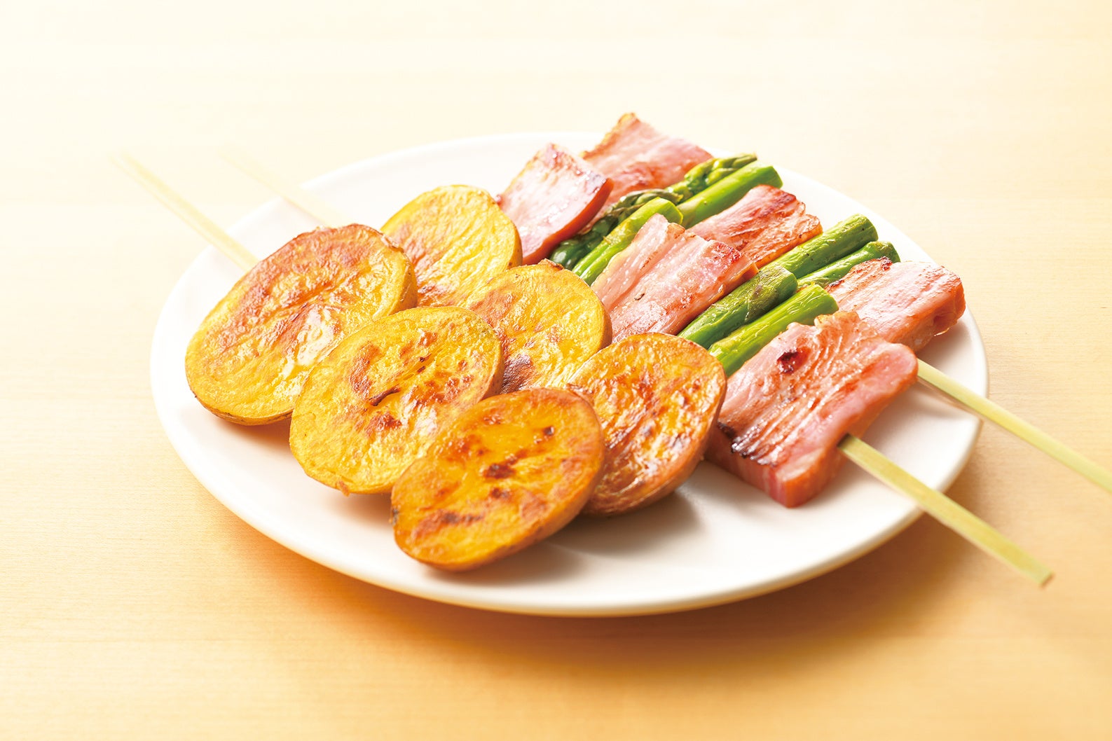 冬の期間熟成させたジャガイモ「インカのめざめ」は、地元でも人気の品種。濃厚なバターでしっかり焼き上げて提供します。また、太く、甘く、柔らかい旬の道産アスパラが楽しめる「厚切りベーコンアスパラ串」などの惣菜グルメのほか、北海道産の旬の野菜もそろいます。