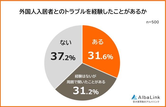 賃貸物件に住んでいる500人に「外国人入居者とのトラブルを経験したことがあるか」を聞いたところ、「ある」と答えた人は31.6%で、3割を超えました。