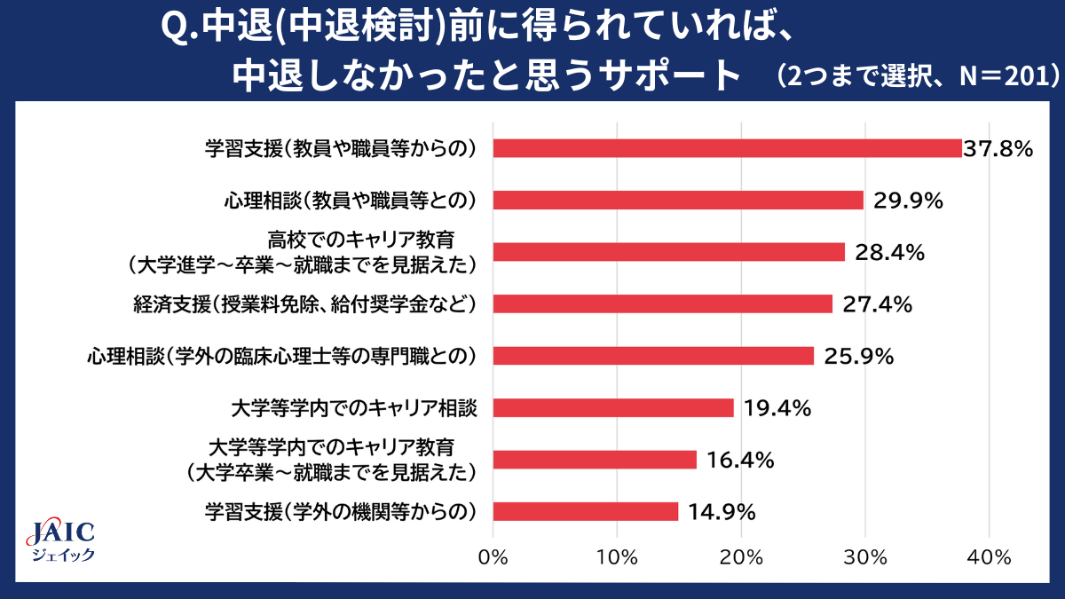 「中退(中退検討)前に得られていれば、中退しなかったと思うサポート」を2つまで選択可で質問したところ、「学習支援(教員や職員等からの)」が37.8%、「心理相談(教員や職員等との)」が29.9%、「高校でのキャリア教育(大学進学~卒業~就職までを見据えた)」が28.4%、「経済支援(授業料免除、給付奨学金など)」が27.4%、「心理相談(学外の臨床心理士等の専門職との)」が25.9%、「大学等学内でのキャリア相談」が19.4%、「大学等学内でのキャリア教育(大学卒業~就職までを見据えた)」が16.4%、「学習支援(学外の機関等からの)」が14.9%となり、進学や就職等を考えるキャリア教育については、大学よりも高校での実施に需要があることがわかりました。