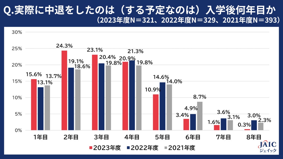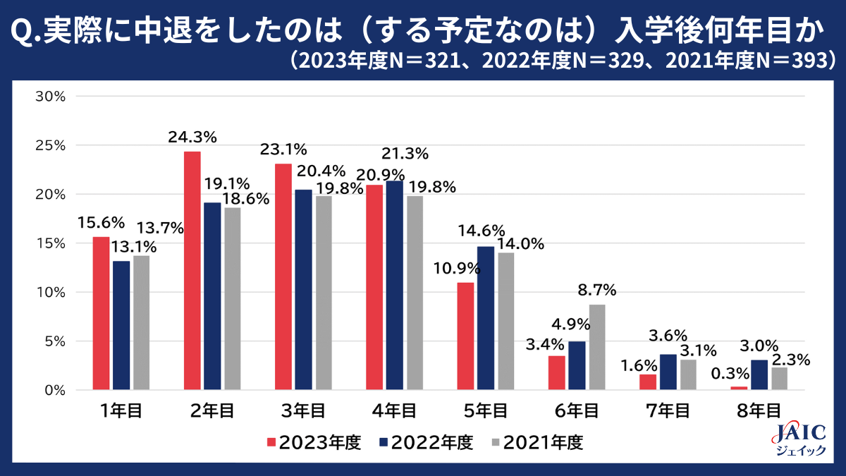 2021年度・2022年度の調査結果と比較すると、「1年目」「2年目」「3年目」はそれぞれ1.9~5.7ポイント増加している一方で、「5年目」「6年目」「7年目」「8年目」はそれぞれ1.5~5.3ポイント減少していることから、中退する年次が早期化している傾向が見受けられました。