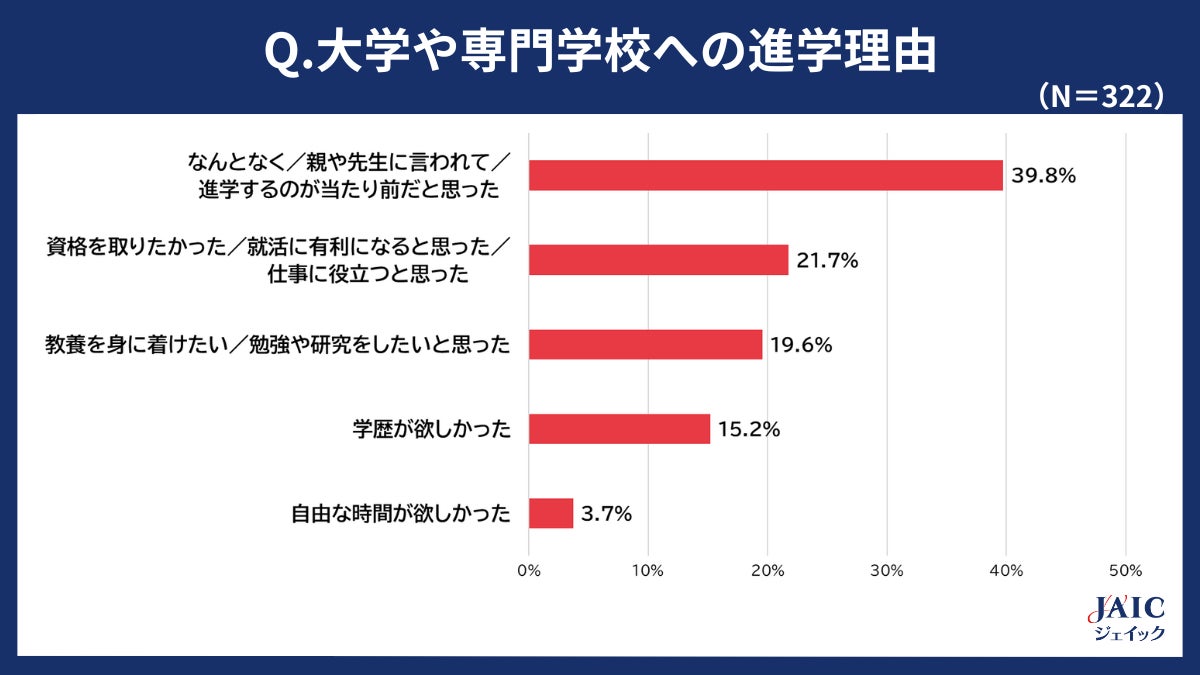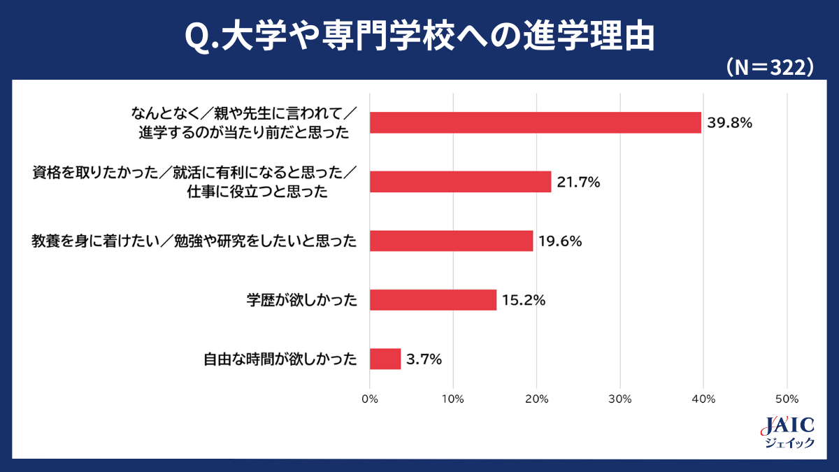 「大学や専門学校への進学理由」を質問したところ、「なんとなく/親や先生に言われて/進学するのが当たり前だと思った」が39.8%、「資格を取りたかった/就活に有利になると思った/仕事に役立つと思った」が21.7%、「教養を身に着けたい/勉強や研究をしたいと思った」が19.6%、「学歴が欲しかった」が15.2%、「自由な時間が欲しかった」が3.7%となりました。