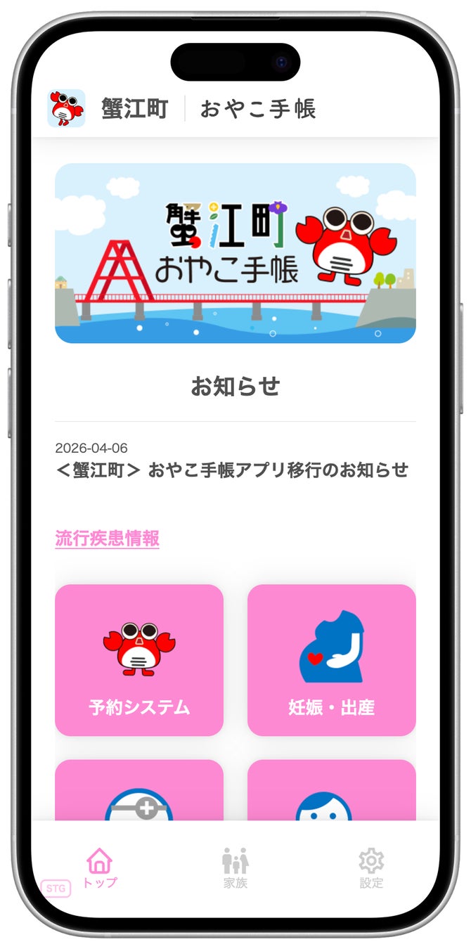 また 既存機能として、蟹江町からのお知らせを月齢・年齢にあわせてタイムリーに受信できる「メール配信・プッシュ通知機能」、予防接種漏れや接種間隔ミスを防ぐことができる「予防接種スケジューラー」、成長グラフや乳幼児健診の記録など母子手帳の内容をマイページに記録できる「電子母子健康手帳 機能」なども 引き続きご利用いただけます。