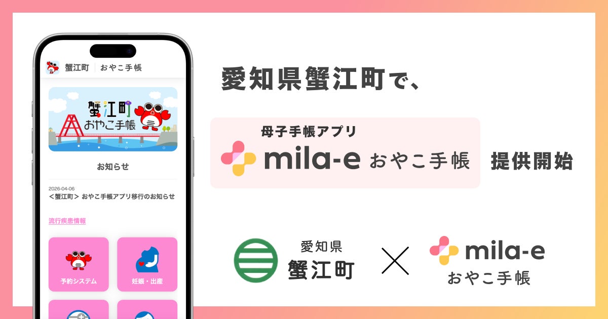 自治体向けサービスを開発する株式会社ミラボ(本社:東京都千代田区、代表取締役:谷川一也、以下「ミラボ」)の母子手帳アプリ「mila-e(ミライー) おやこ手帳」が、愛知県 蟹江町に導入され、「蟹江町おやこ手帳」として 2026年4月6日より提供を開始します。