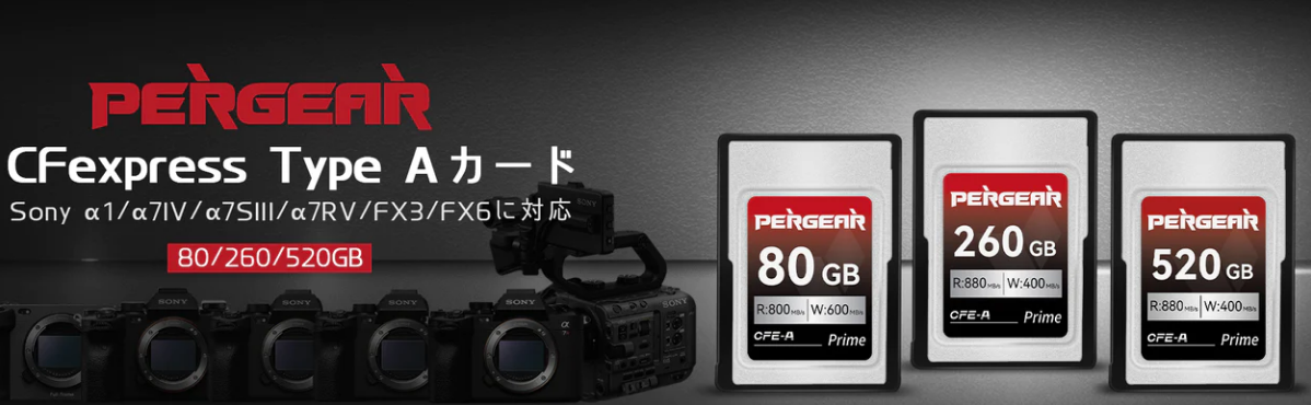 PERGEAR プロフェッショナル CFexpress Type Aメモリーカード、高解像度ビデオ録画用に特別に設計され、4K 120P/8K 30P /4K60Pでの連続録画に対応しています。最大読み込み速度880MB/秒、最大書き込み速度900MB/秒。
