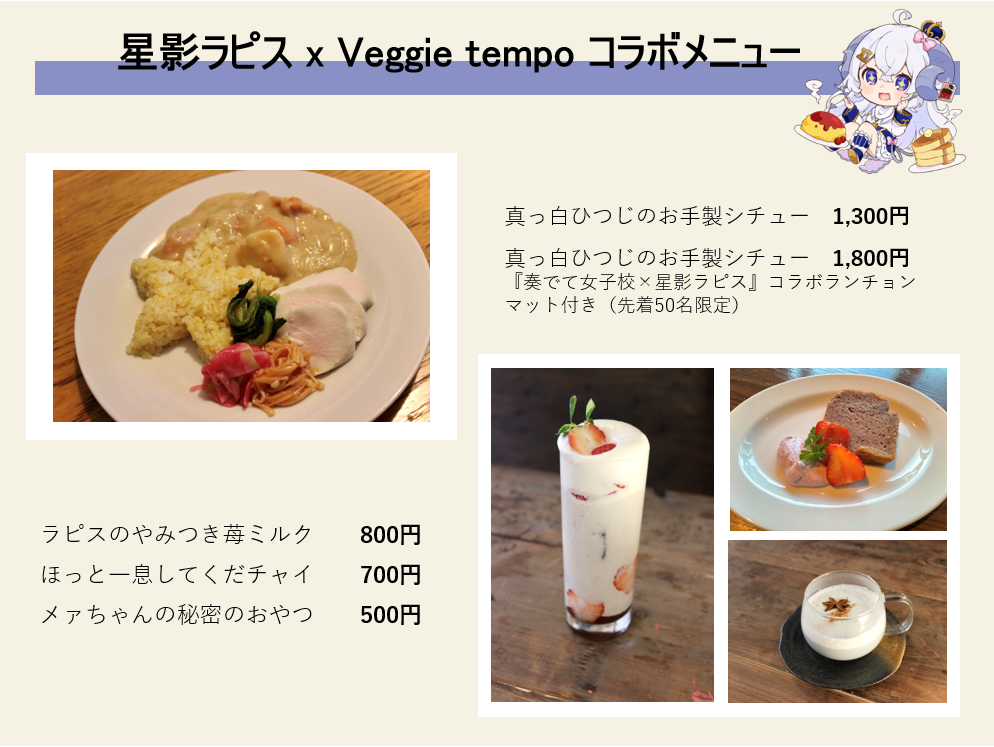 さらに、50枚限定で『奏でて女子校 × 星影ラピス』のランチョンマット付きのコラボメニューをご注文いただけますので、この機会にぜひ、「Veggie tempo」までお立ち寄りください。