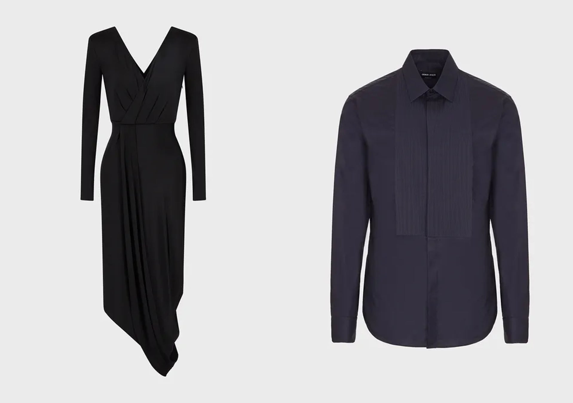 ドレープやデコルテのカットが美しくミディレングスが上品なジャージードレスやラグジュアリーなコットンツイルで比翼仕立てのスリムフィットのシャツはエレガントなイブニングルックにパーフェクトにマッチするアイテムです。