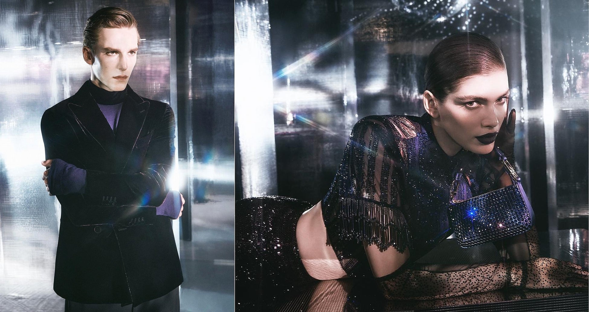 クリスマスギフトのために作られたギフト専用ページを開くと、そこにはグリッターやネオンの輝きがひと際煌めくグラマラスな世界が広がります。そこに佇む男女はジョルジオ アルマーニの艶やかなベルベットやビジューが施されたウエアに身を包みます。これから始まる特別なホリデーナイトに期待が高まります。