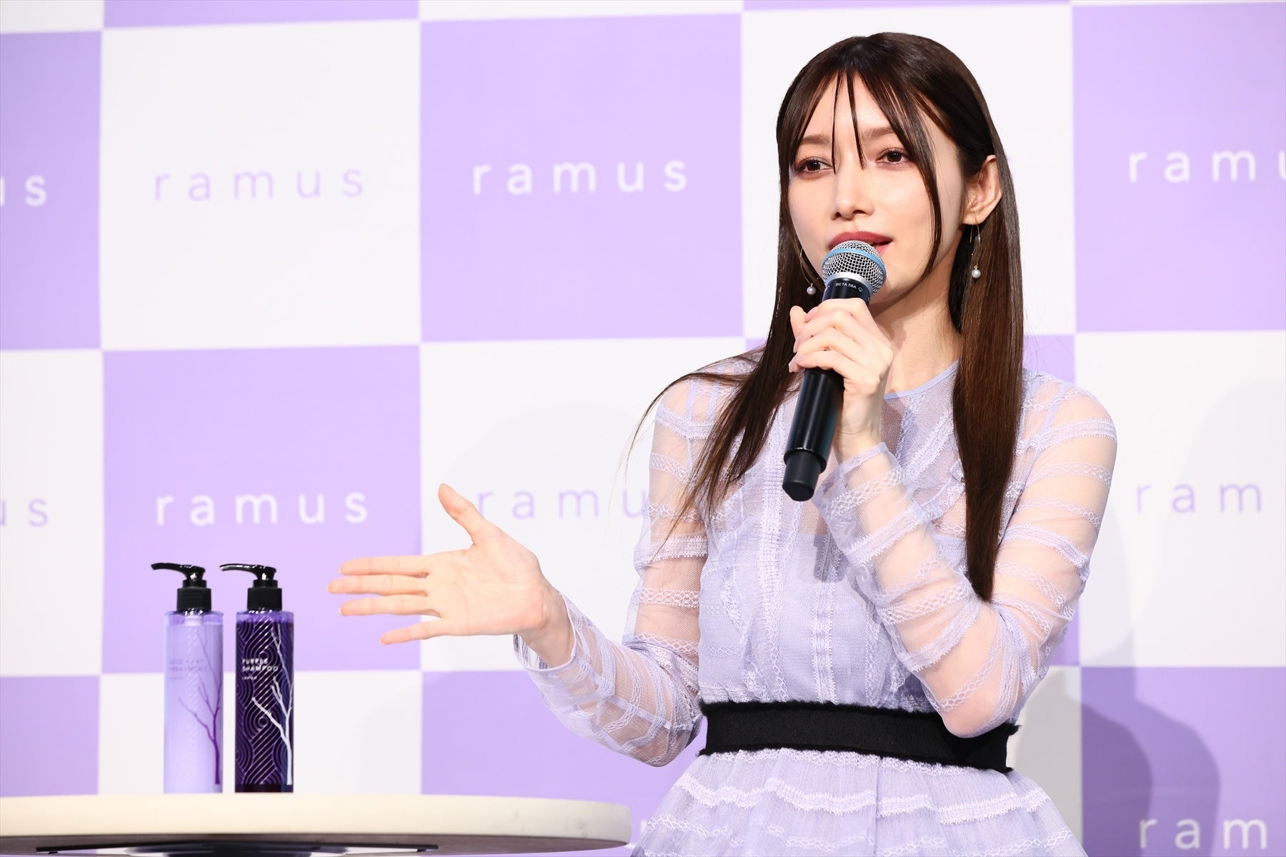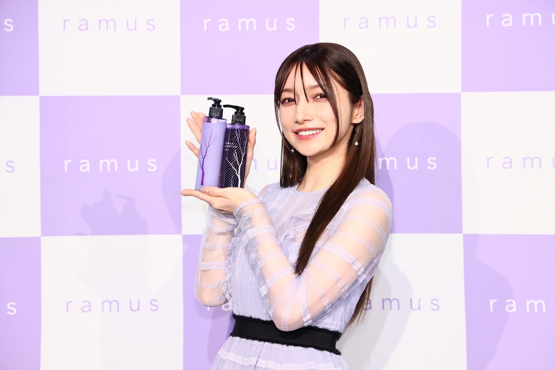 発表会では、商品に合わせた紫色のロングドレスにサラサラの美髪ストレートヘアで登場。ムラシャンを作ろうと思った開発のきっかけを聞かれると「ムラシャンは普段から頻繁に使っていたので、自分の悩みにどのシャンプーが合うかが探しきれないという悩みがありました。探せないなら、作ってみようと思い、開発に至りました。」と話し、ブランド名『ramus』の由来については「『ramus』のラテン語訳は枝という意味で、私自身、デビューからたくさんの出会いに感謝を感じることがありました。この商品にも自分のように1本から始まり、枝のようにたくさんの出会いを作れたらいいなと思っています。」と、自身の経験を振り返りコメント。