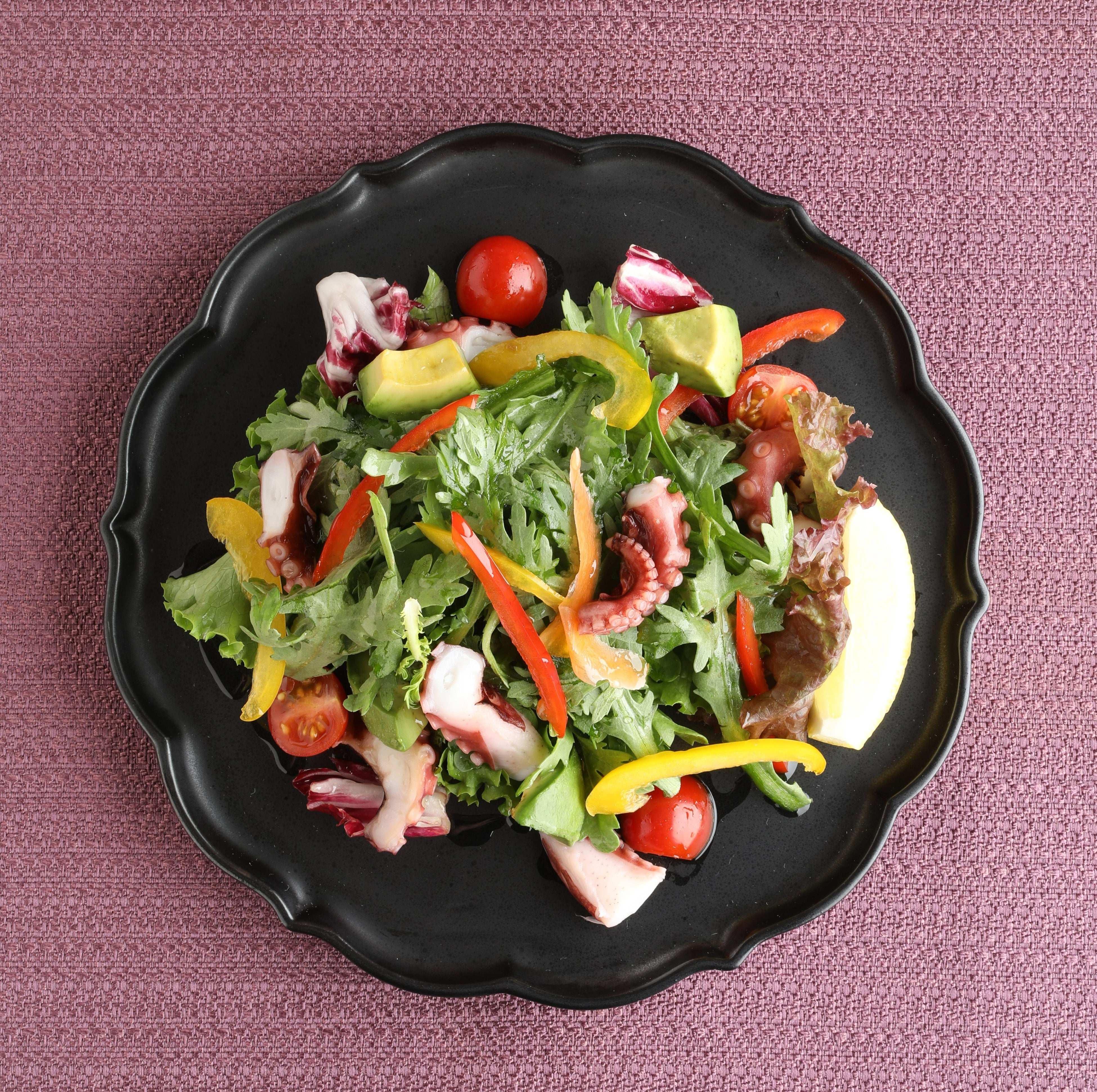 冬に旬を迎える『柳蛸(やなぎだこ)』を、春菊・パプリカ等の香味野菜と一緒にお楽しみいただく冬のサラダ。