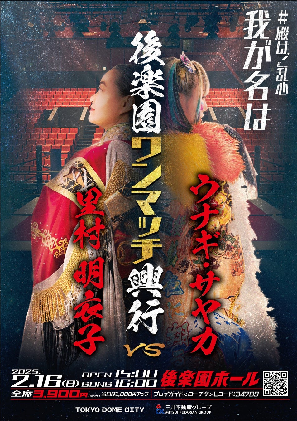 東京ドーム自主興行を目標にプロレス界を翔る傾奇者ウナギ・サヤカ選手が、2025年4月29日(火・祝)に後楽園ホールで引退をする女子プロレス界の横綱 里村明衣子選手に挑む。両選手とも後楽園ホールデビューであり、最初で最後の両者のシングルマッチになります。後楽園ホールに新たな歴史が生まれる興行になります。