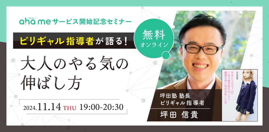 株式会社日本能率協会マネジメントセンター(代表取締役社長:張 士洛、東京都中央区、以下JMAM[ジェイマム])は、運営するWebサービス「ahame(アハミー)」開始記念の第2弾セミナーとして、共同開発・監修者である坪田信貴先生をお招きし、11月14日(木)に無料オンラインセミナー「ビリギャル指導者が語る! 大人のやる気の伸ばし方」を開催します。(セミナー詳細: https://ahame241114.peatix.com/?utm_source=prtimes&utm_medium=referral )