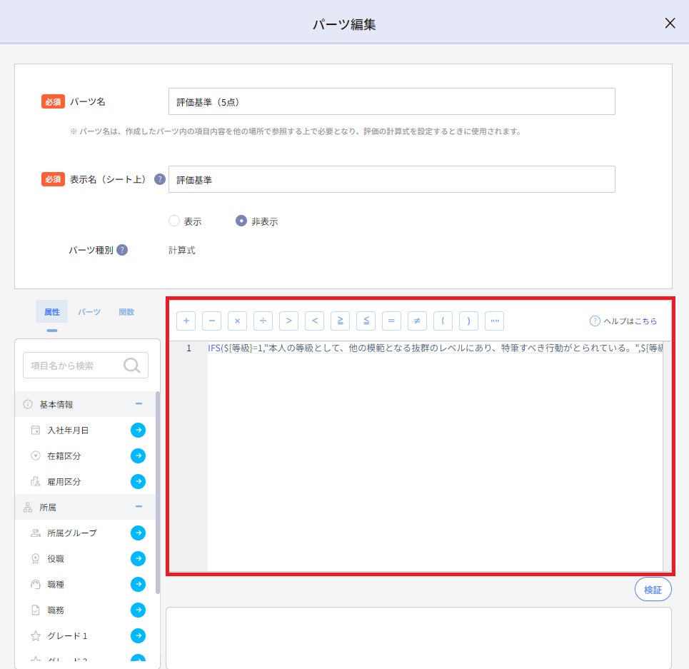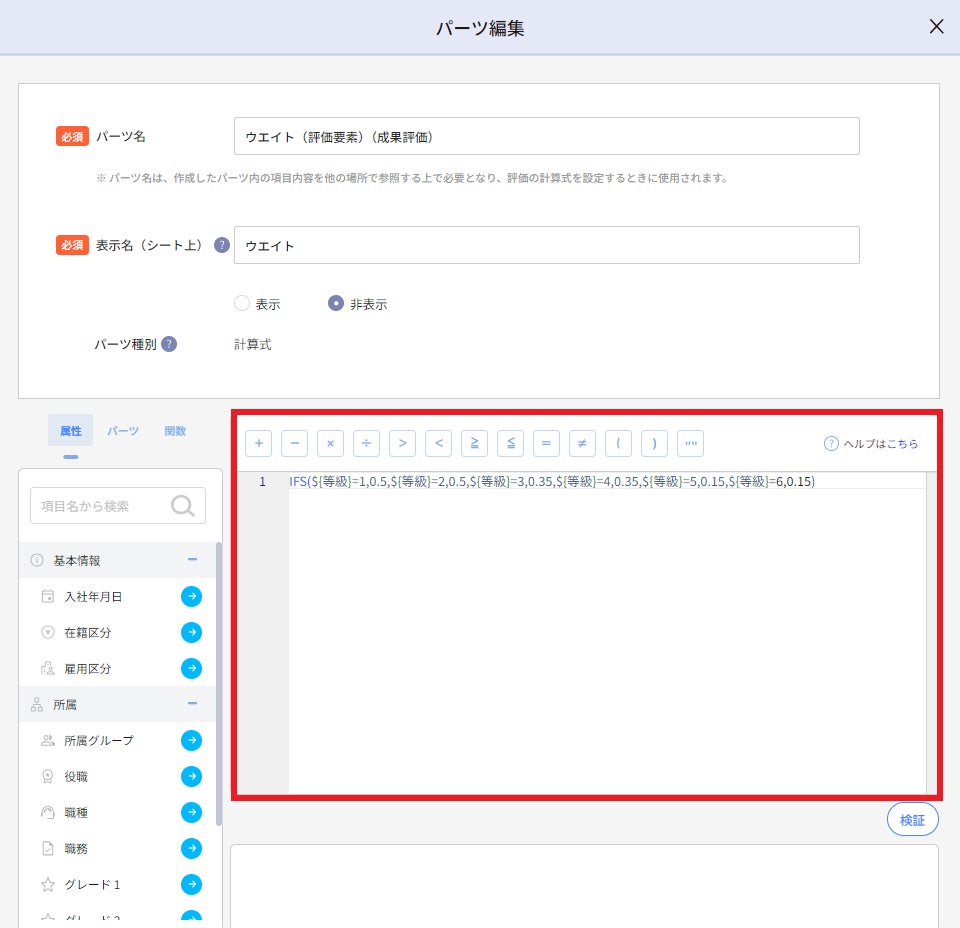 テンプレートには、予め等級/評価基準等に応じて、「ウエイト(評価の比重)」の計算式が組まれています。ウエイトの計算式は、企業の評価ルールに沿って細かく設定変更できることから、評価シートを用いた人事評価をより迅速に行うことができます。