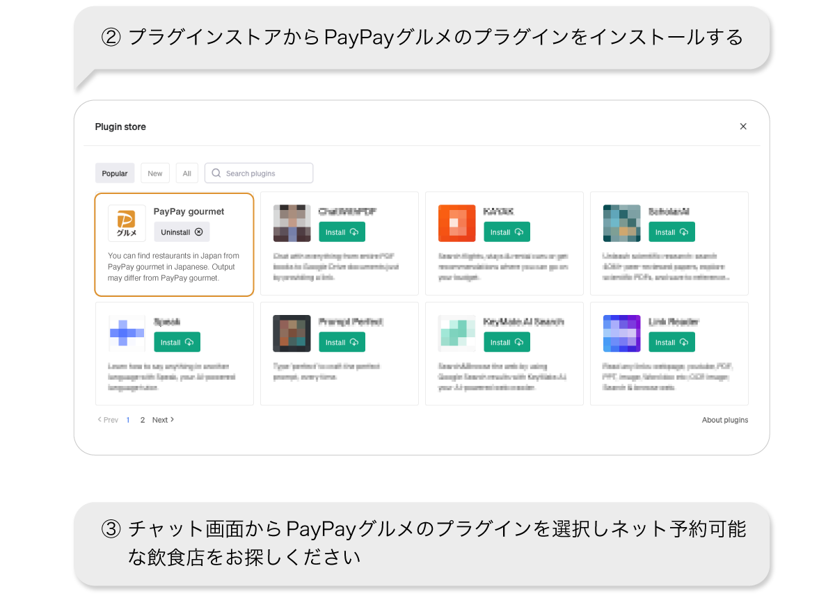 本機能の利用時には、ChatGPT上の設定画面よりプラグインを有効にして、プラグインストアから「PayPayグルメ」のプラグインをインストールします。チャット画面から「PayPayグルメ」のプラグインを選択し、日時やエリア、人数、飲食店ジャンルなどの希望する条件をChatGPTと会話するだけで、「PayPayグルメ」の情報の中から、希望条件に沿った飲食店を簡単に探すことができます。