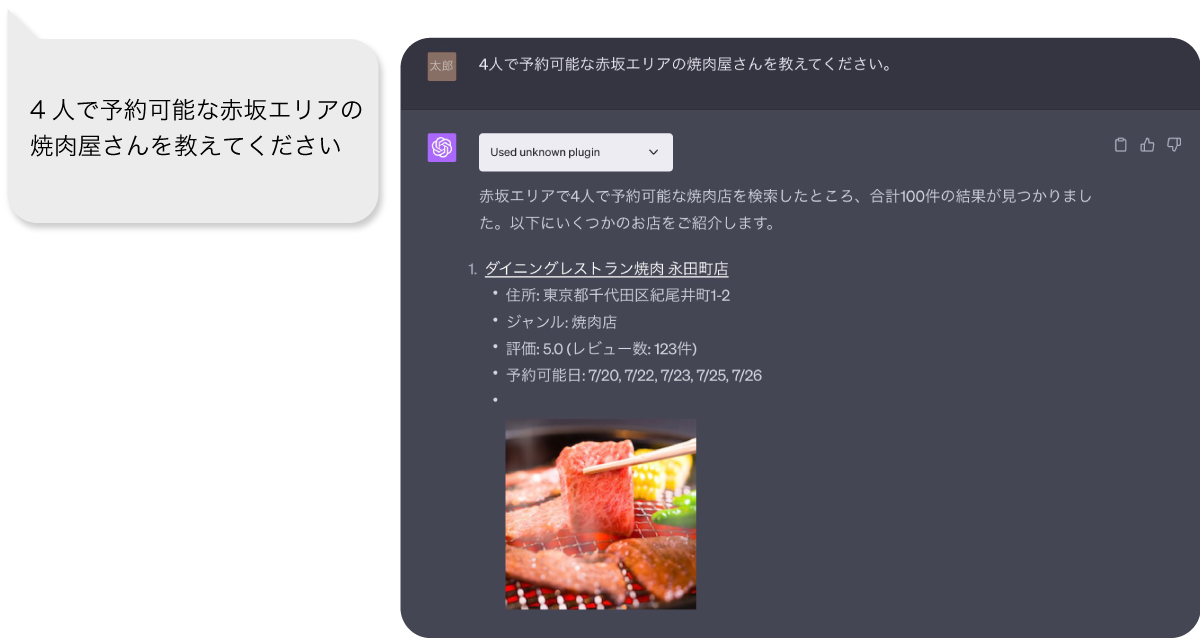 ChatGPTに「4人で予約可能な赤坂エリアの焼肉屋さんを教えてください」と入力