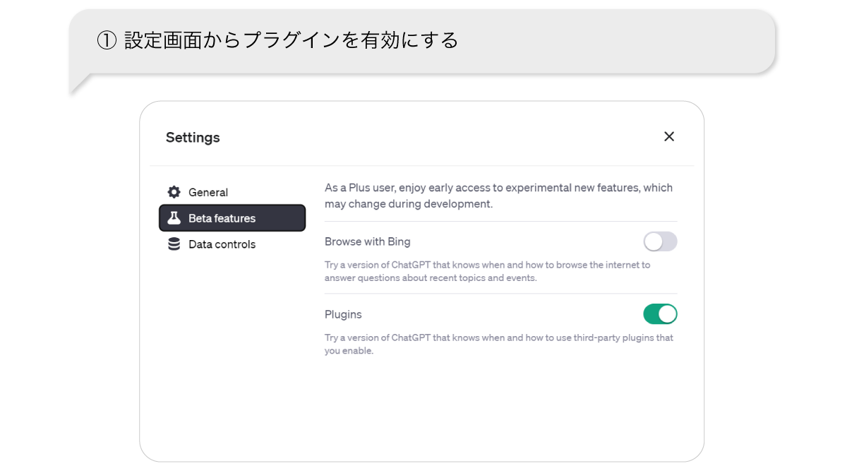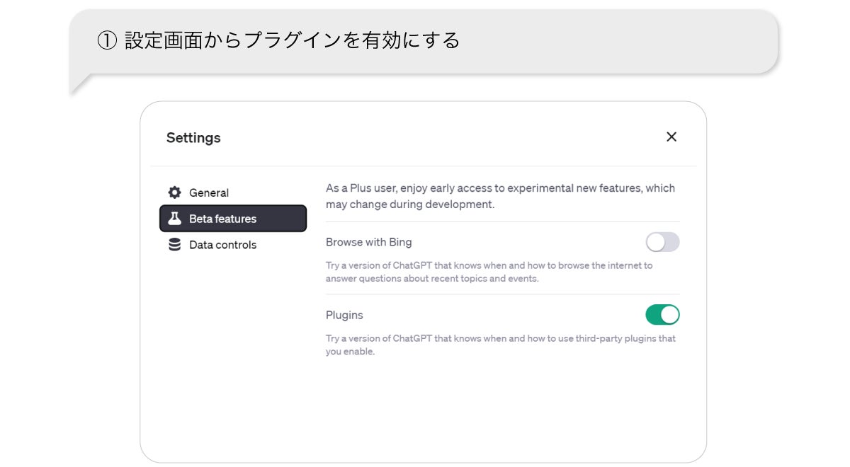 本機能はChatGPTの有料版であるChatGPT Plusが対象です。本機能を利用する際には、プラグイン設定を有効にしてご利用ください。