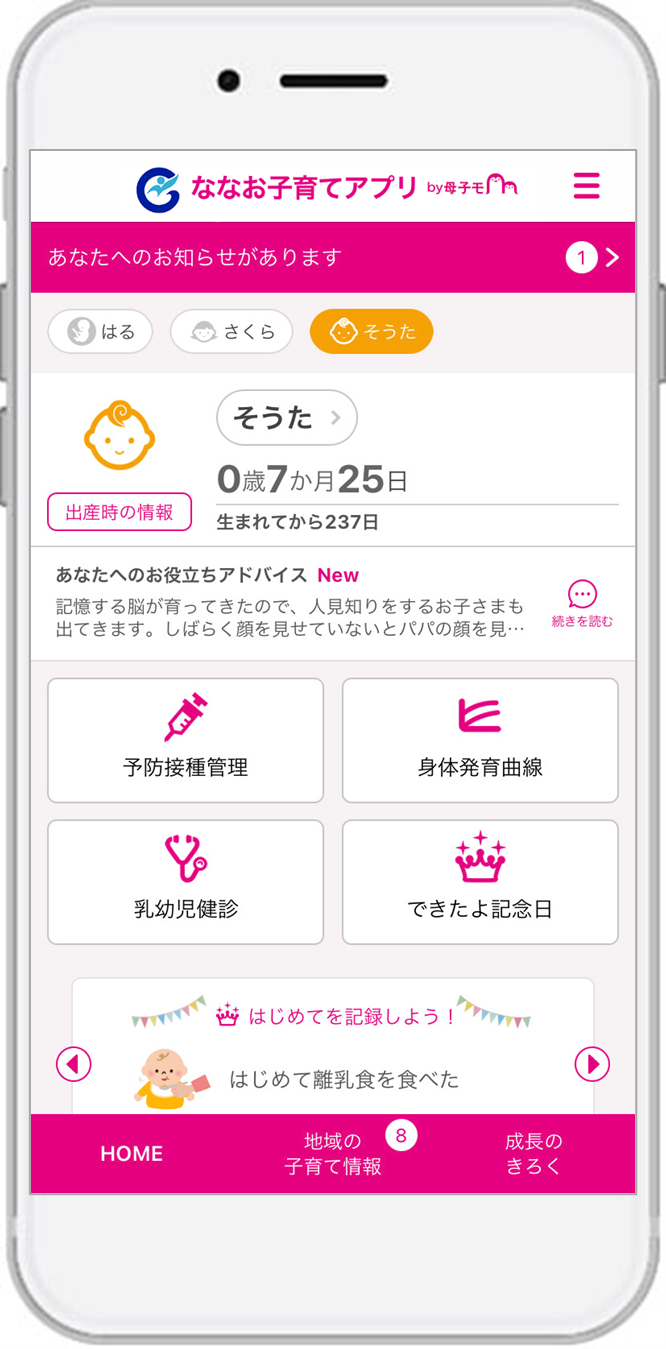 石川県七尾市に採用された『ななお子育てアプリ』は、妊産婦と子どもの健康データの記録・管理や予防接種のスケジュール管理、出産・育児に関するアドバイスの提供、離れた地域に住む祖父母など家族との共有機能や、市が配信する地域の情報をお知らせするなど、育児や仕事に忙しい母親や父親を助けてくれる便利な機能が充実しています。