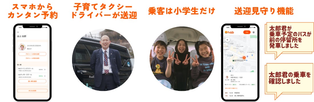 参加方法 | ・参加を希望する場合は、次の参加ページから送迎を希望する場所や、習い事施設に通う日時などを登録します。 (参加ページ) https://habshuttle.com/prerunning ・登録した希望場所や日時をもとに、AIが「相乗りタクシー」の運行ルート・時刻や「停留所」を決定し、参加者に通知します。 ・参加者は実際に乗車する前々日までに乗車予約を行った上で、「相乗りタクシー」の「停留所」から、小学生のみで乗車(相乗り)します。 |
