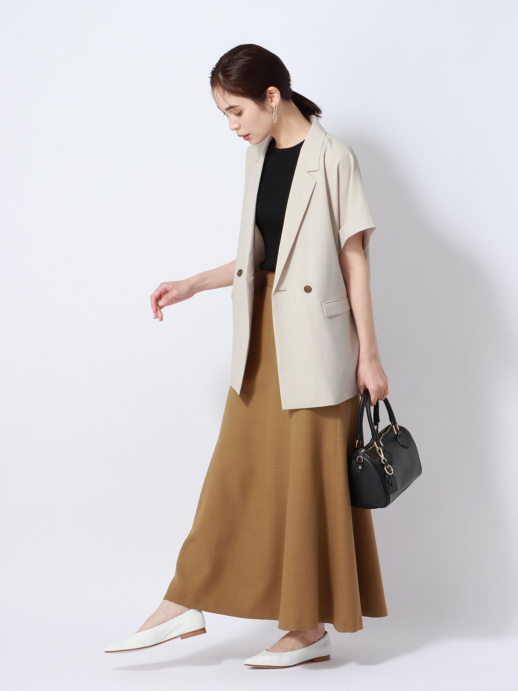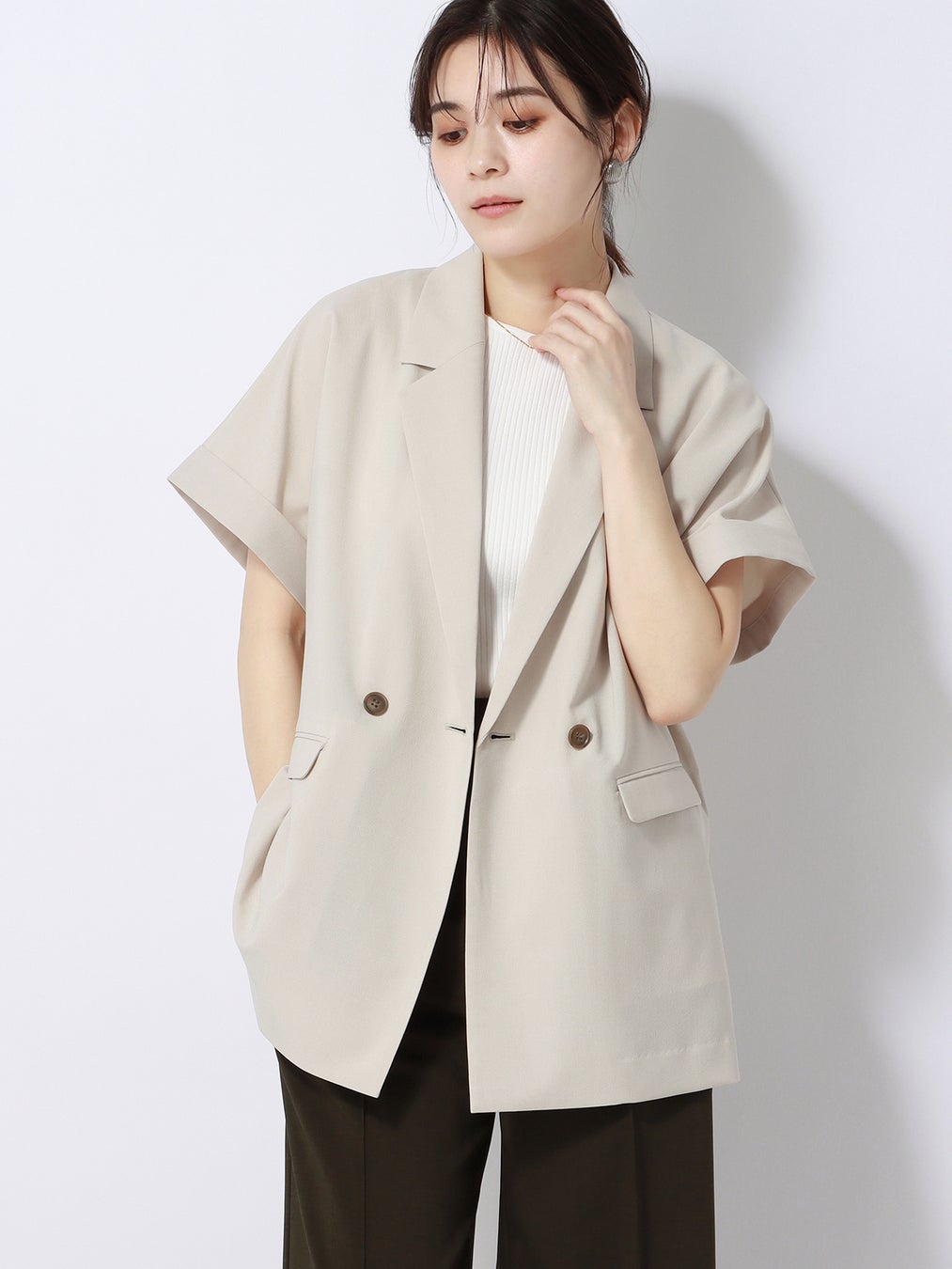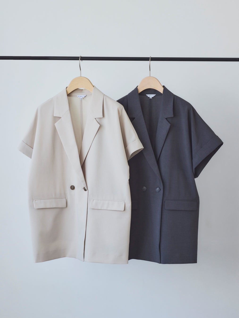 ジャケットの袖は、二の腕が隠れる絶妙な長さに調整し、気になる腕周りを隠すことができる仕様にしました。さらに袖口を広くすることで、腕がすっきりと見え、お客様が潜在的に抱えている半袖にありがちな悩みを解消する工夫も施しています。また、ウエストラインは控えめに絞り、着丈をヒップ周りが隠れる長さに調整するなど、体型カバーできる設計にしている他、ビジネスシーンでも使いやすいテーラードジャケットを企画したことできちんと感を演出しました。商談や出張などでジャケットが必要な場面でもカジュアル見えしすぎず上品に着用できます。