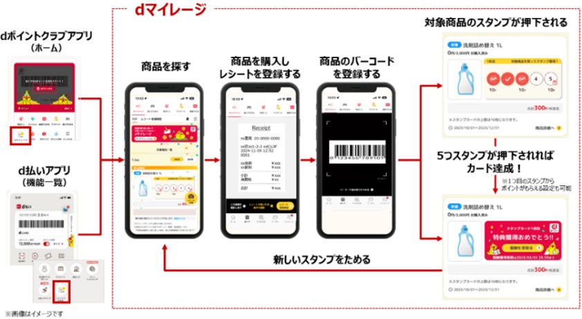 本サービスは、対象商品を購入し、「dポイントクラブ」アプリ、「d払い®」アプリ、または「dポイントクラブ」サイトで、購入時のレシートと商品のバーコードを登録するとスタンプがたまるサービスです。スタンプカードは商品ごとで、同じ商品を購入するたびにスタンプがたまり、1枚のカードに5個までためることができます。1個・3個・5個の時点でそれぞれdポイント(期間・用途限定)が獲得できます※4※5。なお、購入する店舗や決済手段の指定はないため、身の回りの普段使うお店で、いつもの支払い方法で対象商品を購入するだけで、おトクにdポイントをためていただくことができます※6。ご利用料金は無料です。