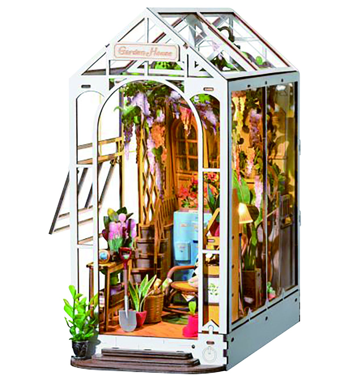 天井、正面、側面の壁は透明なフィルムが使用されており、正面だけではなく、様々な角度から見ることができる点も特徴的です。LEDライトも付属しており、天井と間接照明の2か所がライトアップする仕様です(※単4電池2本別売り)。