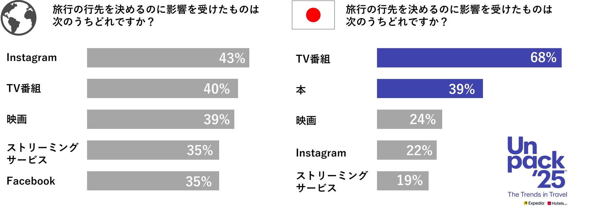 また、旅行先選定で影響を受けたものについて、世界の旅行者で最も多かった回答が「Instagram(43%)」、次いで「TV番組(40%)」、「映画(39%)」と続くのに対し、日本では依然として7割近くの旅行者が「TV番組(68%)」、4割近くが「本(39%)」と回答しており、昔ながらのメディアの影響力が大きいことが伺えます。