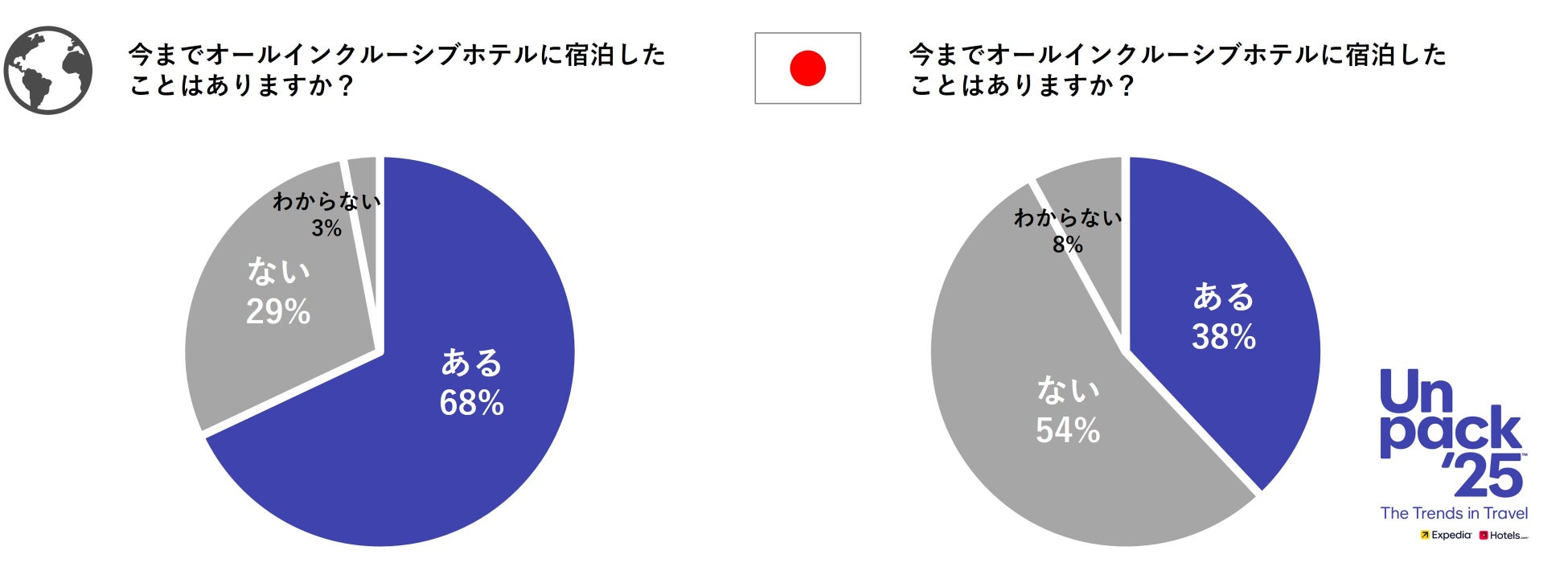 一方で、オールインクルーシブホテルでの宿泊経験について、世界の68%が「ある」と回答したのに対し、日本人は38%に留まりました。オールインクルーシブホテルに関しては、日本人旅行者において、今後伸びしろのあるカテゴリーであることが伺えます。