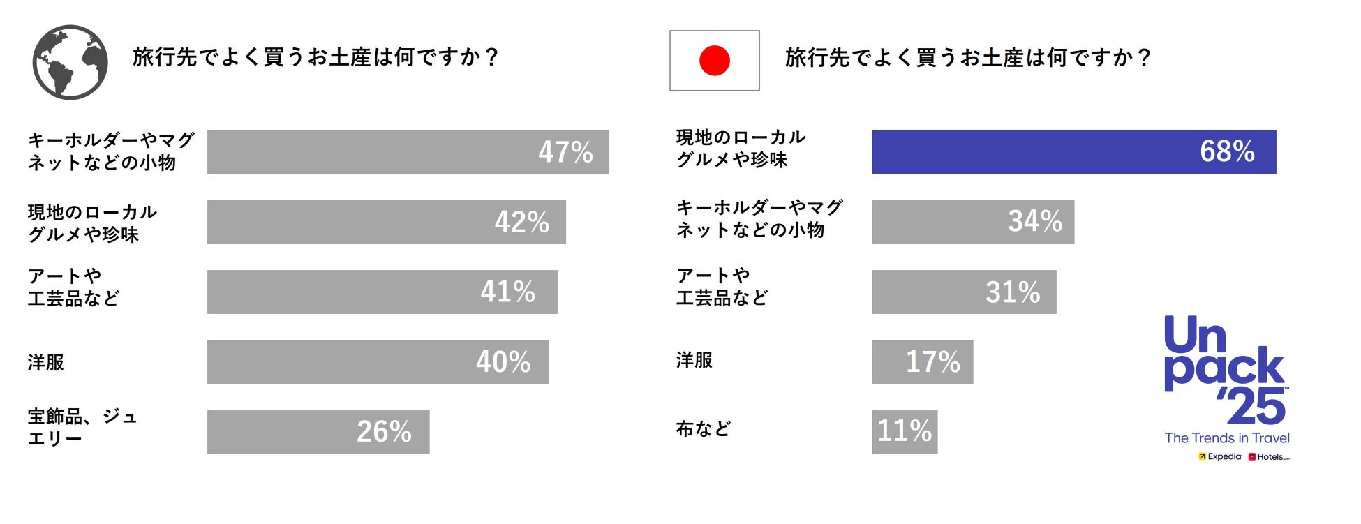 また、旅行先でよく買うお土産について最も多かった回答は、世界の旅行者では「キーホルダーやマグネットなどの小物(47%)」だったのに対し、日本人は「現地のローカルグルメや珍味(68%)」と約7割近くの人が回答し、世界で最も多い割合となりました。
