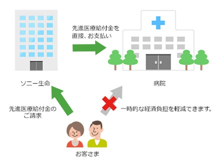 「先進医療給付金の医療機関あて直接支払サービス」は、お客さまの一時的な経済負担を軽減し安心して治療を受けていただくため、高額な先進医療である重粒子線治療と陽子線治療を対象に、当社が先進医療給付金を医療機関に直接お支払いするサービスです※1。