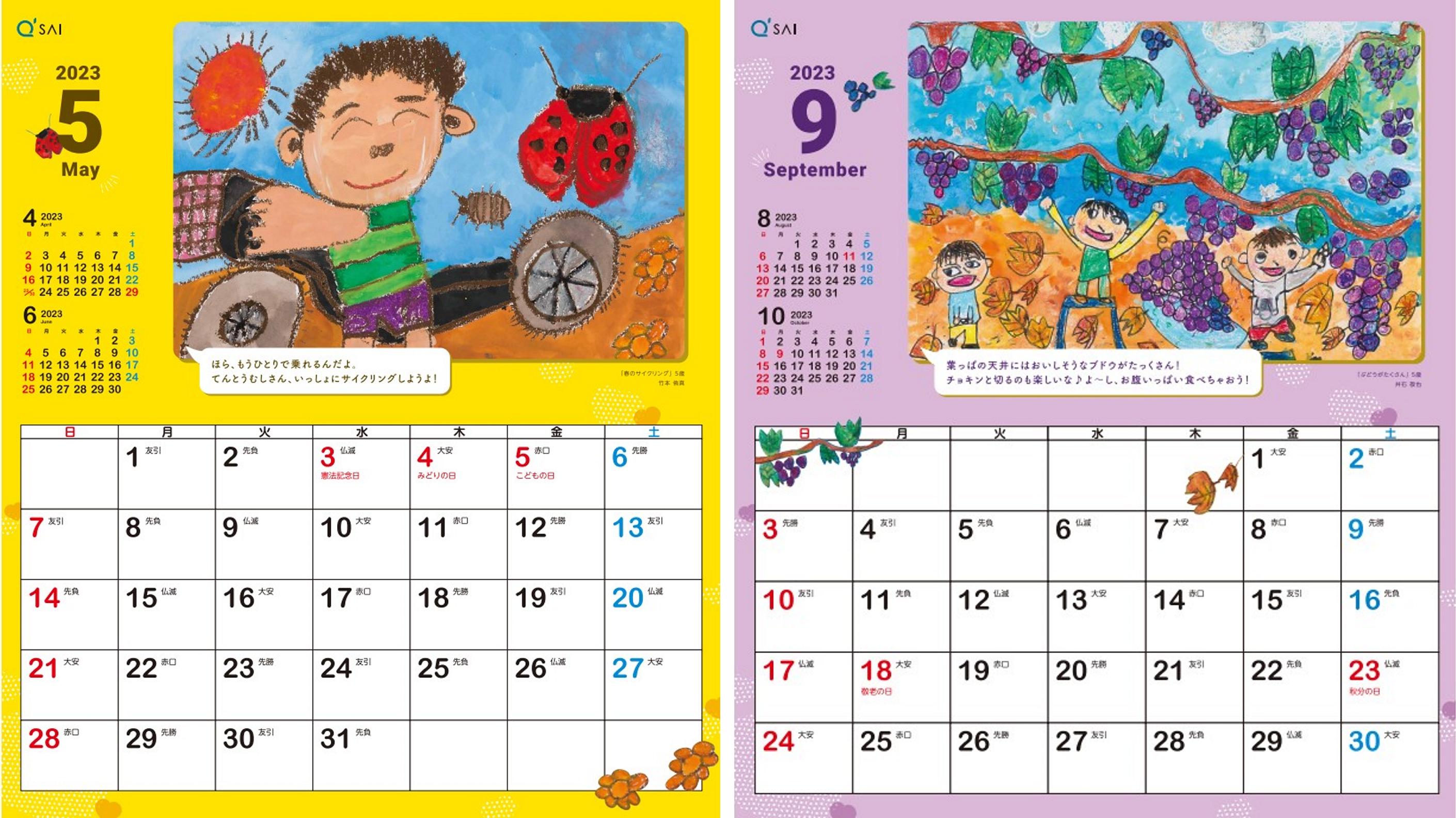 キューサイ株式会社(本社:福岡市中央区、代表取締役社長:佐伯 澄)は、『2024年キューサイカレンダー』に掲載する絵画を、小学生以下の子どもを対象に募集開始いたします。今年のテーマは「人生初を、いつまでも。」というコーポレートスローガンにちなみ「はじめての思い出」としました。子どもたちの”人生初”の出来事や体験の、ドキドキ、わくわくする気持ちを「人生初・山登り」「人生初・海あそび」「人生初・犬の散歩」などタイトルをつけて、彩り豊かな絵画にしてご応募ください。