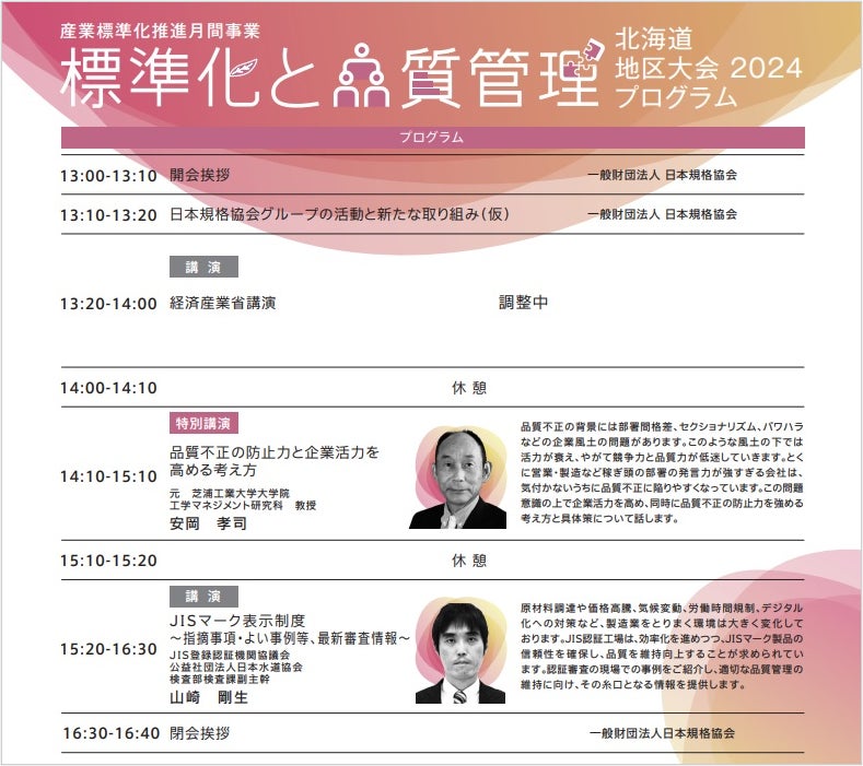 例年大好評のJIS登録認証機関協議会によるJISマーク表示制度の最新情報はもちろんのこと、品質不正に関する特別講演、経済産業省による講演など、充実のプログラムで皆様のお越しをお待ちしております。
