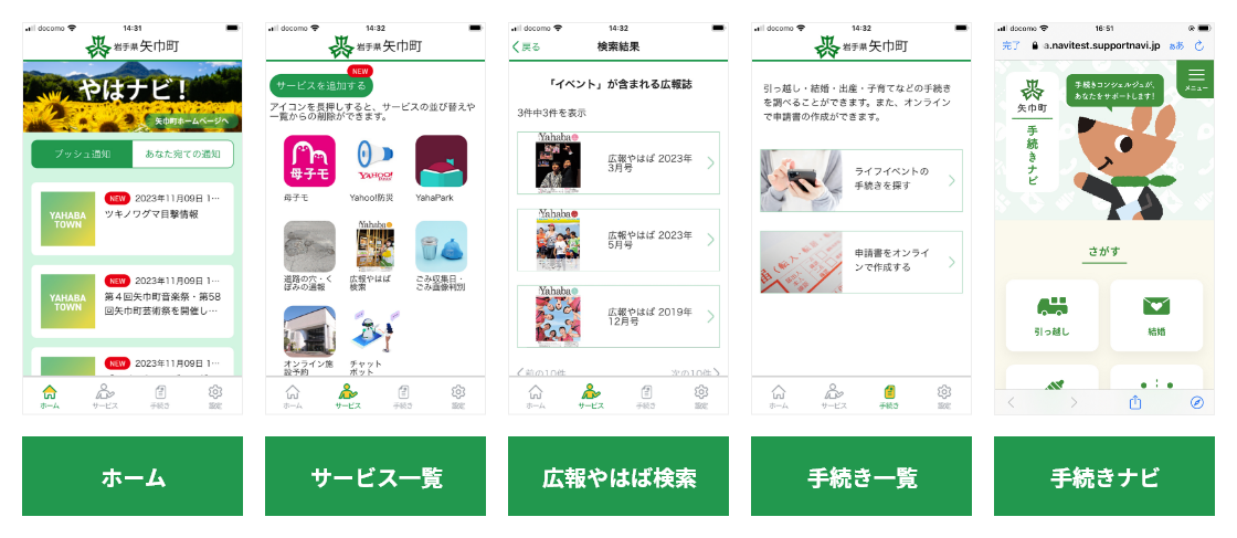 『やはナビ!』は、矢巾町の行政サービスとして住民に提供するアプリや情報などを一元化した、住民総合ポータルアプリです。アプリ上において、必要な各種申請書の作成や、広報誌の記事検索などの住民サービスの利用が可能です。