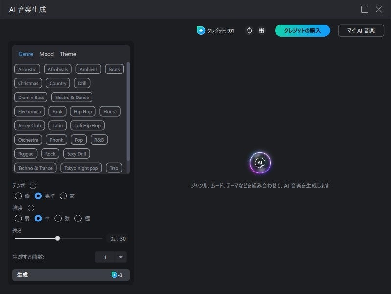 この AI 音楽生成機能の使用には毎回 3 クレジット消費します。