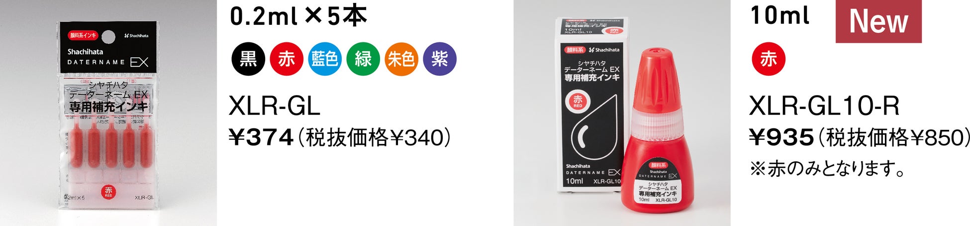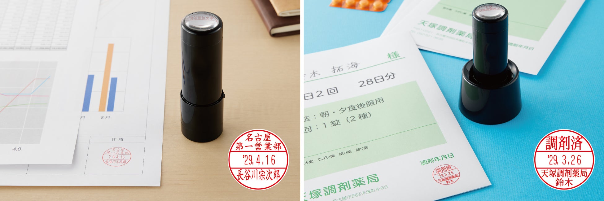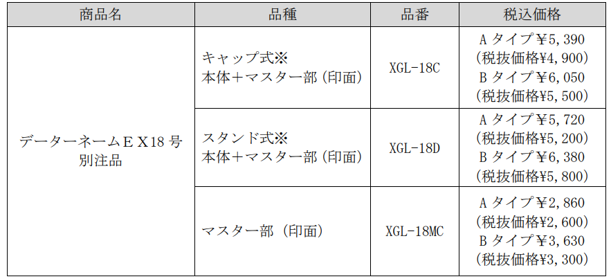 ビジネスでは「いつ」「誰が」なつ印を行ったのかが、ひと目で分かることが重要であり、加えて、日付は書類管理をする上で大切なポイントにもなります。これらの要素を兼ね備え、日付と名前をスタンプできる「データーネームEX」は、今まで12号(印面サイズ12.5㎜丸)と15号(印面サイズ15.5mm丸)の2種類の印面サイズで展開してきました。今回、さらに広い印面スペースで多い文字数でも見やすい18.5mm丸の「データーネームEX18号」を新たに増種します。タイプは、キャップ式とスタンド式の2種類。手を汚さずに簡単に日付を変えられるダイヤルや、わずかなくぼみの指さぐりで簡単に上下が確認でき真っすぐ押せるよう工夫された形状など、データーネームEXの使いやすさを踏襲しました。オフィスでの書類管理や医療機関での調剤済のサイン、ショップでの賞味期限・保証期限の表記、検品チェック済のサインや出荷の管理など、さまざまなビジネスシーンでご利用いただくことが可能です。また、要望の多かったボトルタイプの「専用補充インキ・赤10ml」も発売します。