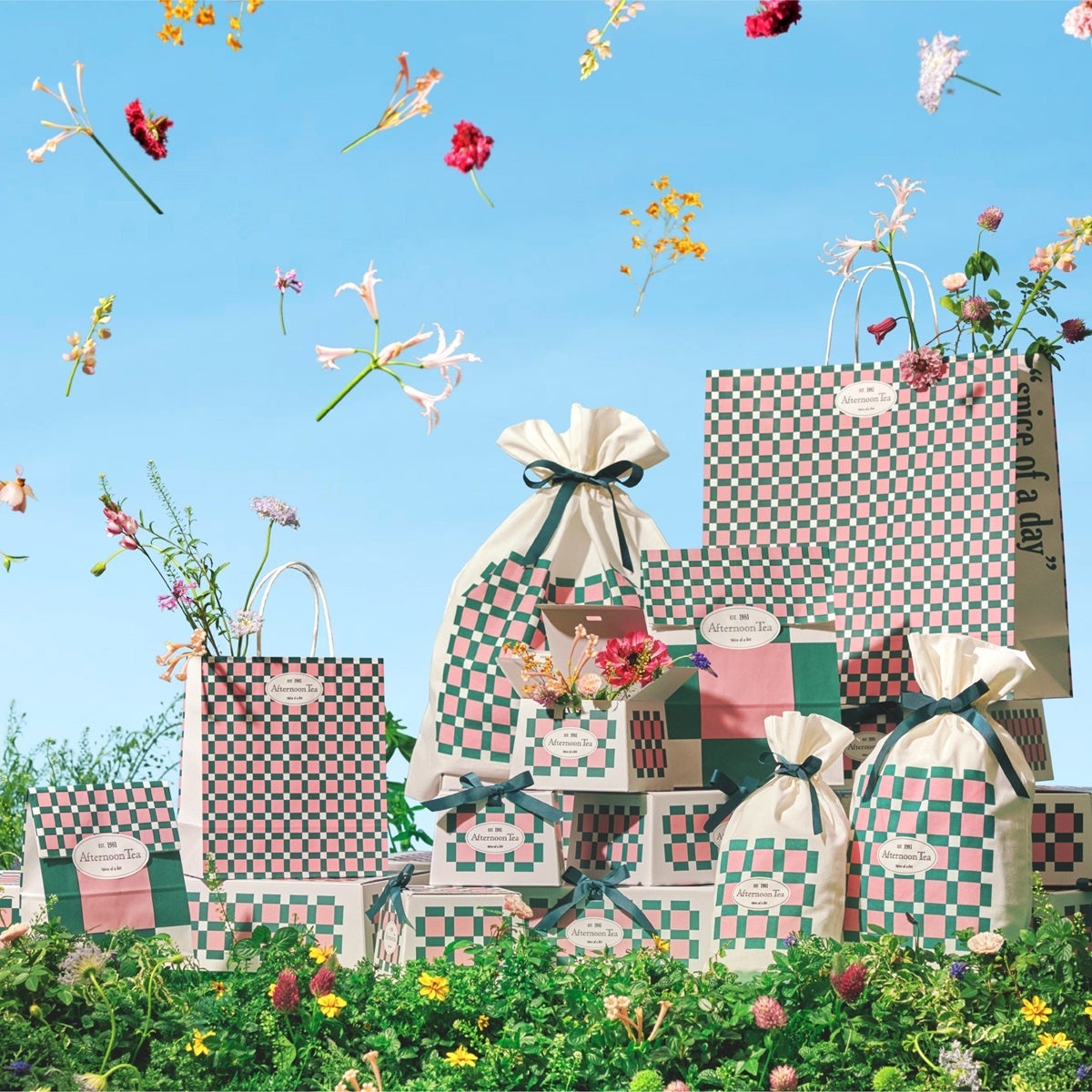 <Point1:環境配慮> 巾着にはコットン素材を使用。カジュアルギフトにおすすめのペーパーバッグは有料化へ。 <Point2:デザインを一新> ブランドの創業当時、店頭に掲げられていた桜の木の下でお茶を楽しむ“Afternoon Tea”のアート。 そんなブランドを象徴するシーンを、現代的な幾何学アートに昇華させ、クラシカルな印象とモダンな新鮮さを両立させる佇まいに仕上げました。 |