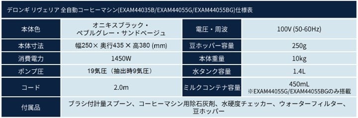 ミルクモデルのEXAM44055G/EXAM44055BGはミルクメニュー8種類とコーヒーメニュー8種類、合わせて16種類のメニューを搭載し、コーヒーモデルのEXAM44035Bはコーヒーメニュー8種類を搭載しています。