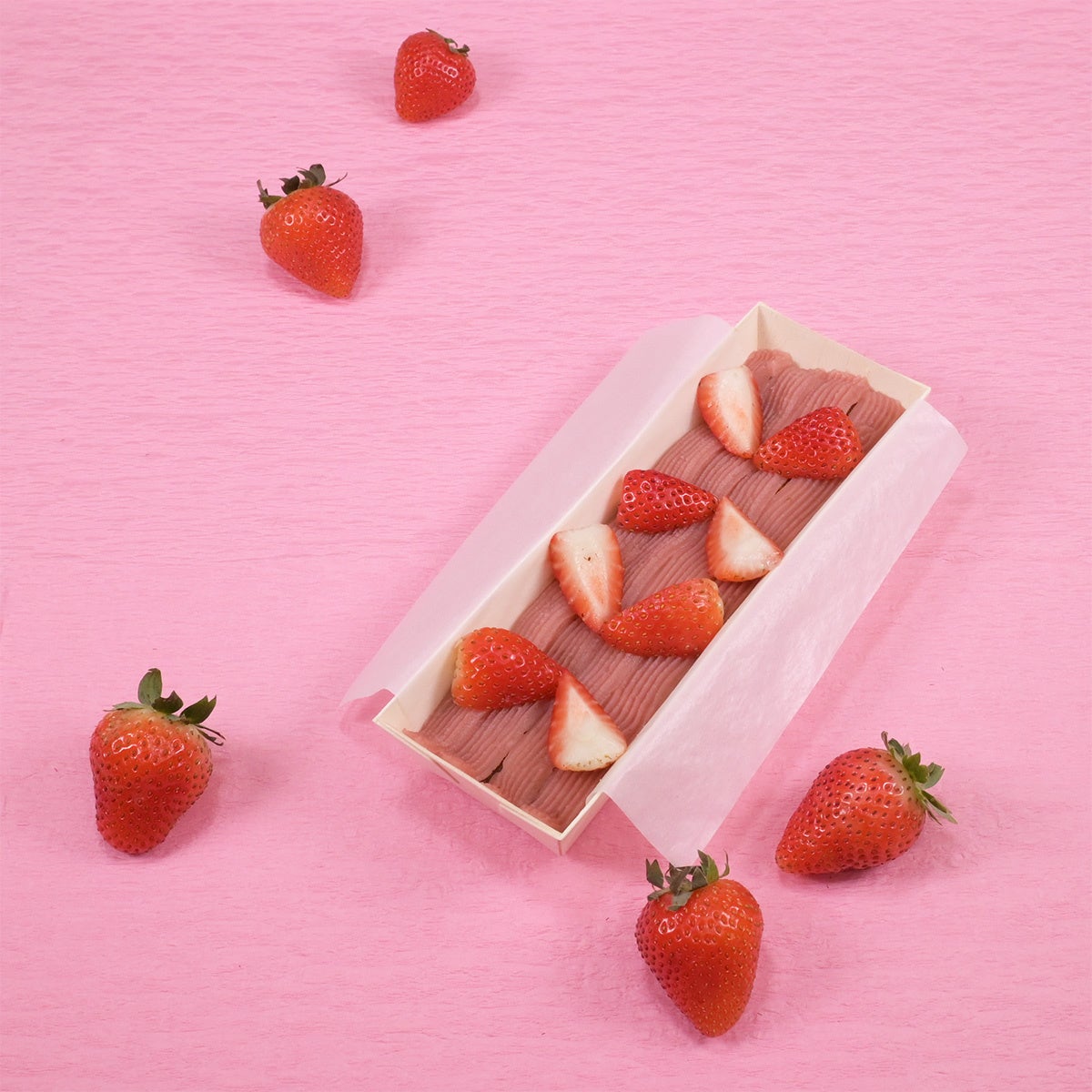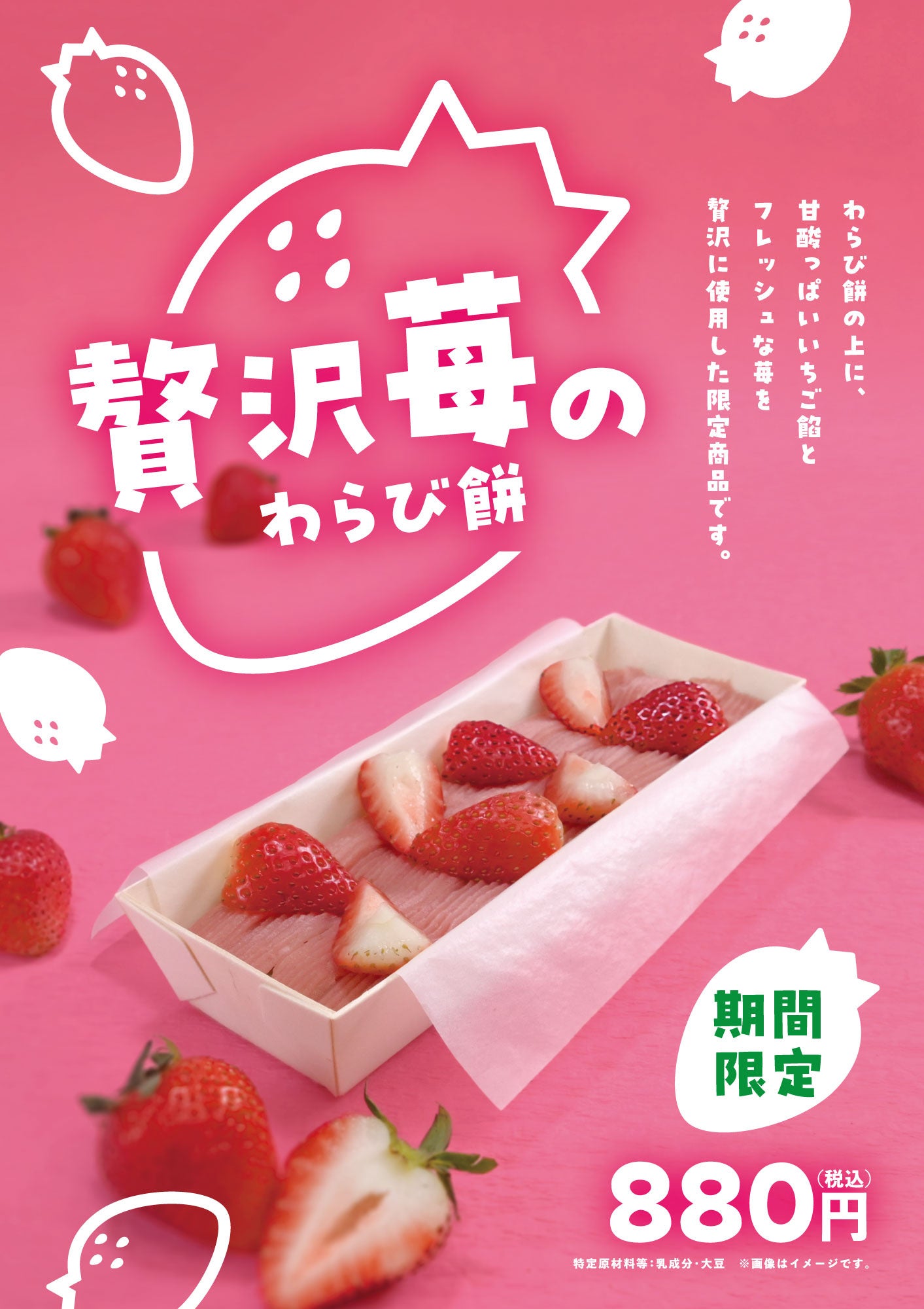 わらび餅の上に、甘酸っぱいいちご餡とフレッシュ苺を贅沢に使用。冬にぴったりの限定商品です。