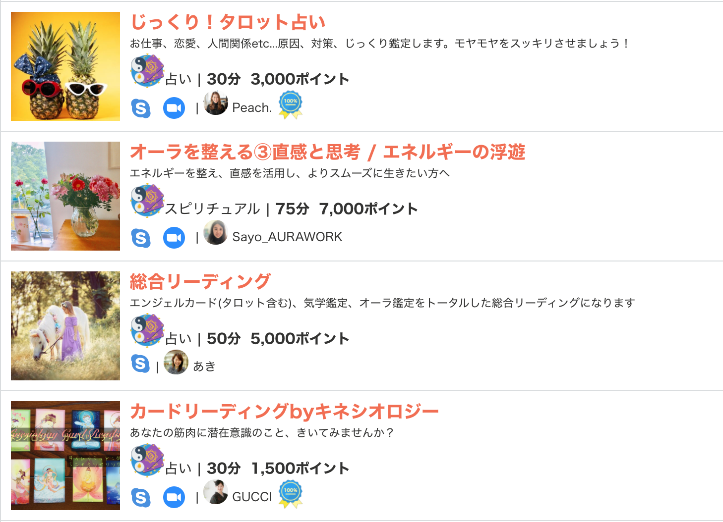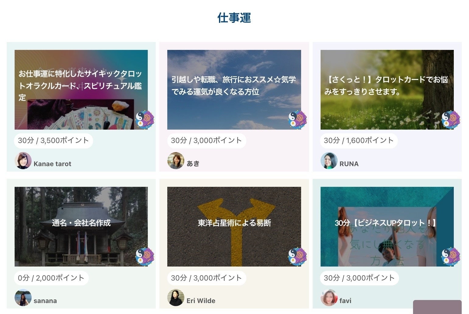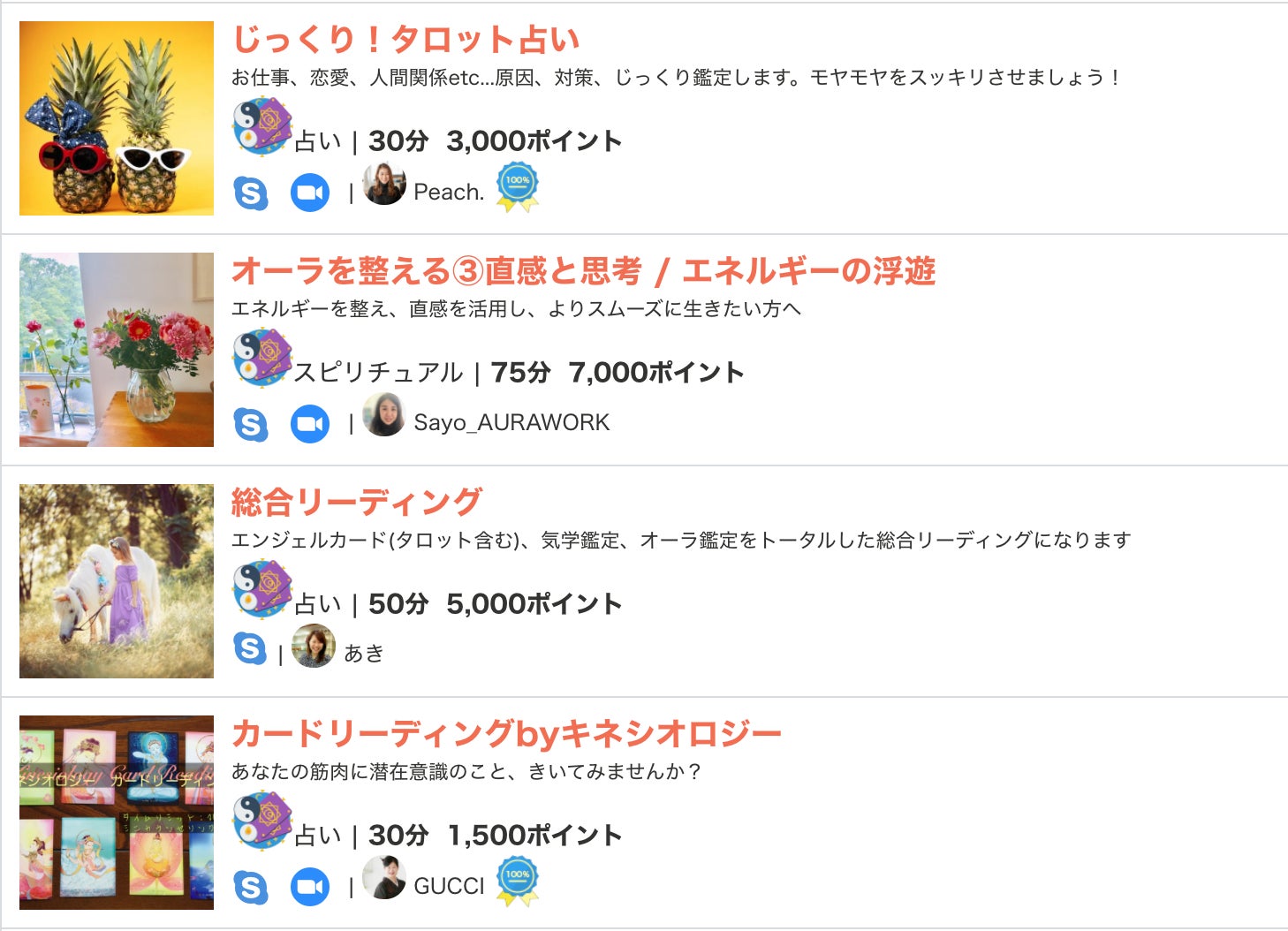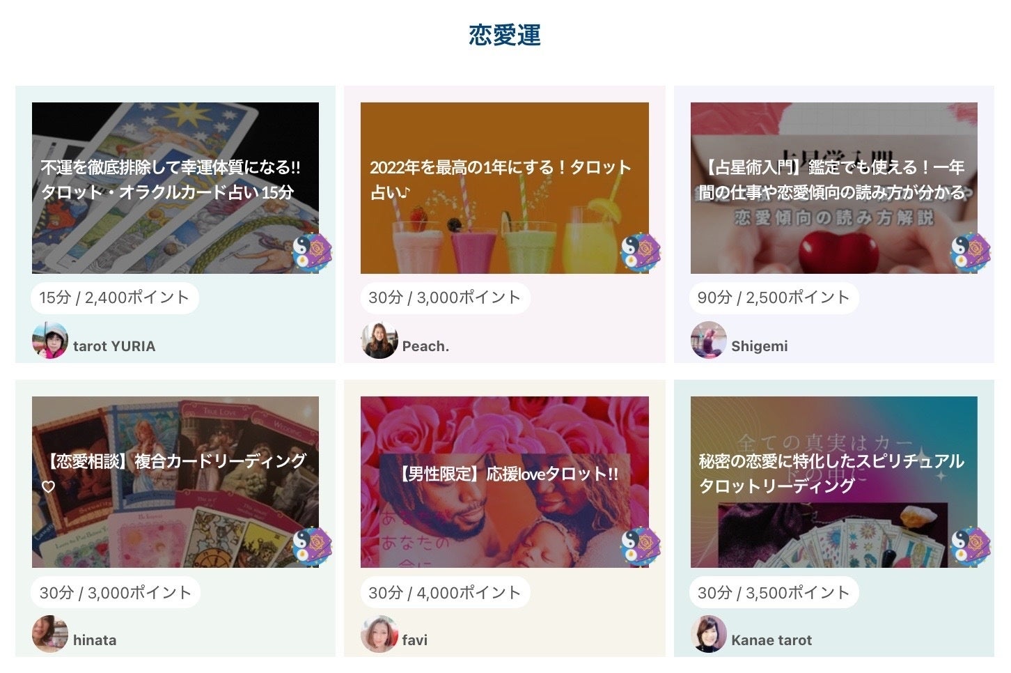 タロット、オーラリーディング、占星術、手相、四柱推命、ミディアムシップ、前世占い、数秘術、姓名判断など様々な占いが揃っています。
