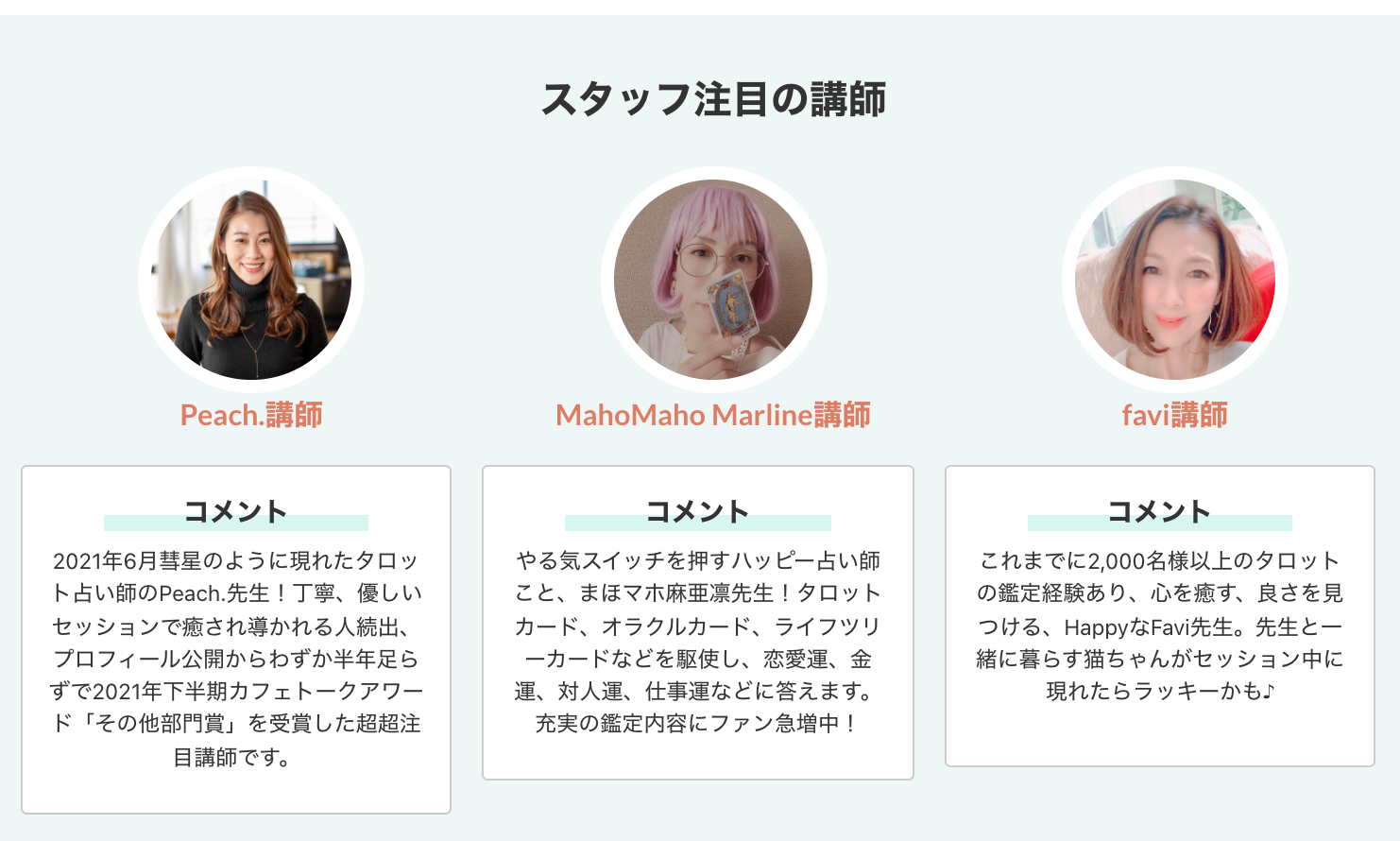 実際にご受講された生徒様の口コミも合わせて掲載、初めてカフェトークで占いを受けてみるという方から、いつもと違う占いを試してみたい、という方にもご参考になる特集になっております。